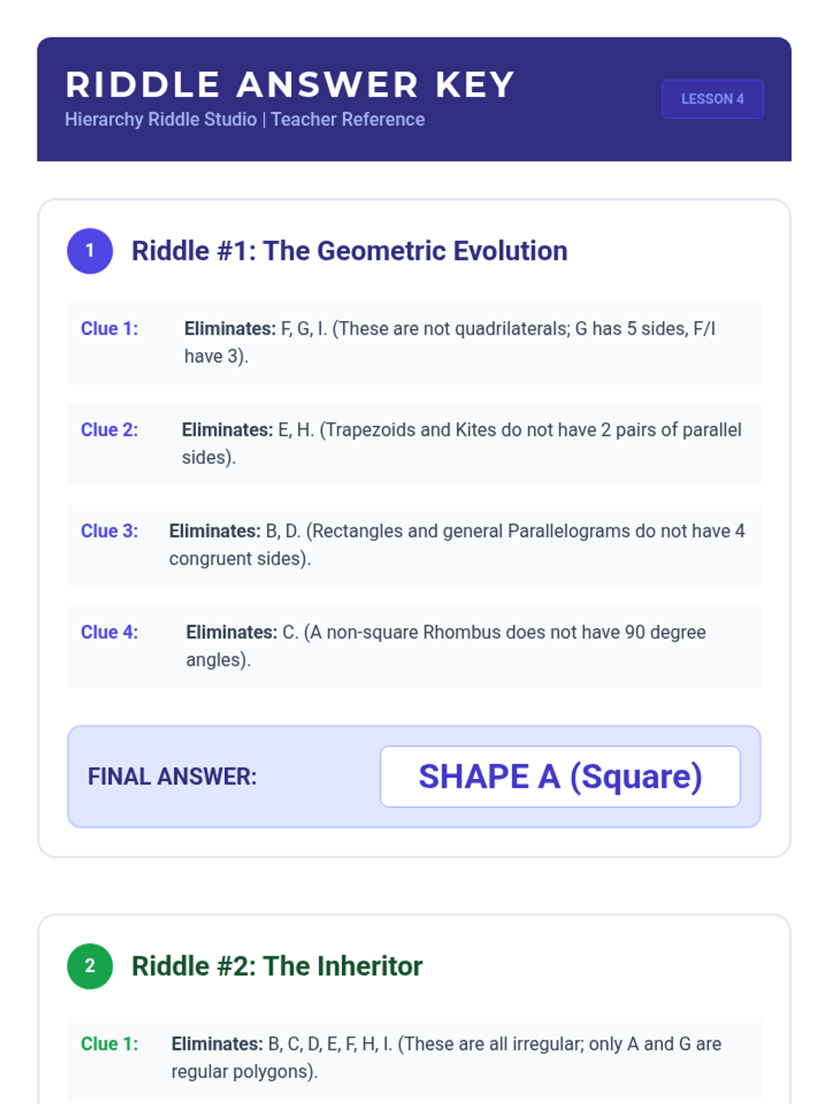 Teacher answer key for the Hierarchy Riddles. Provides step-by-step elimination logic for both riddles and explains the inheritance properties for pedagogical reinforcement.