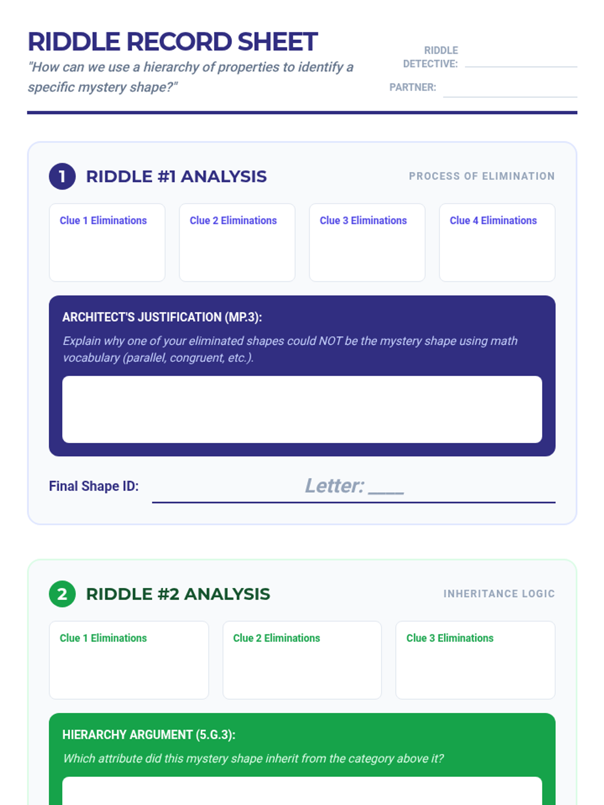 Student recording sheet for the Hierarchy Riddle lesson. Includes structured areas for documenting the elimination process for two classroom riddles and an enrichment section for students to create their own.