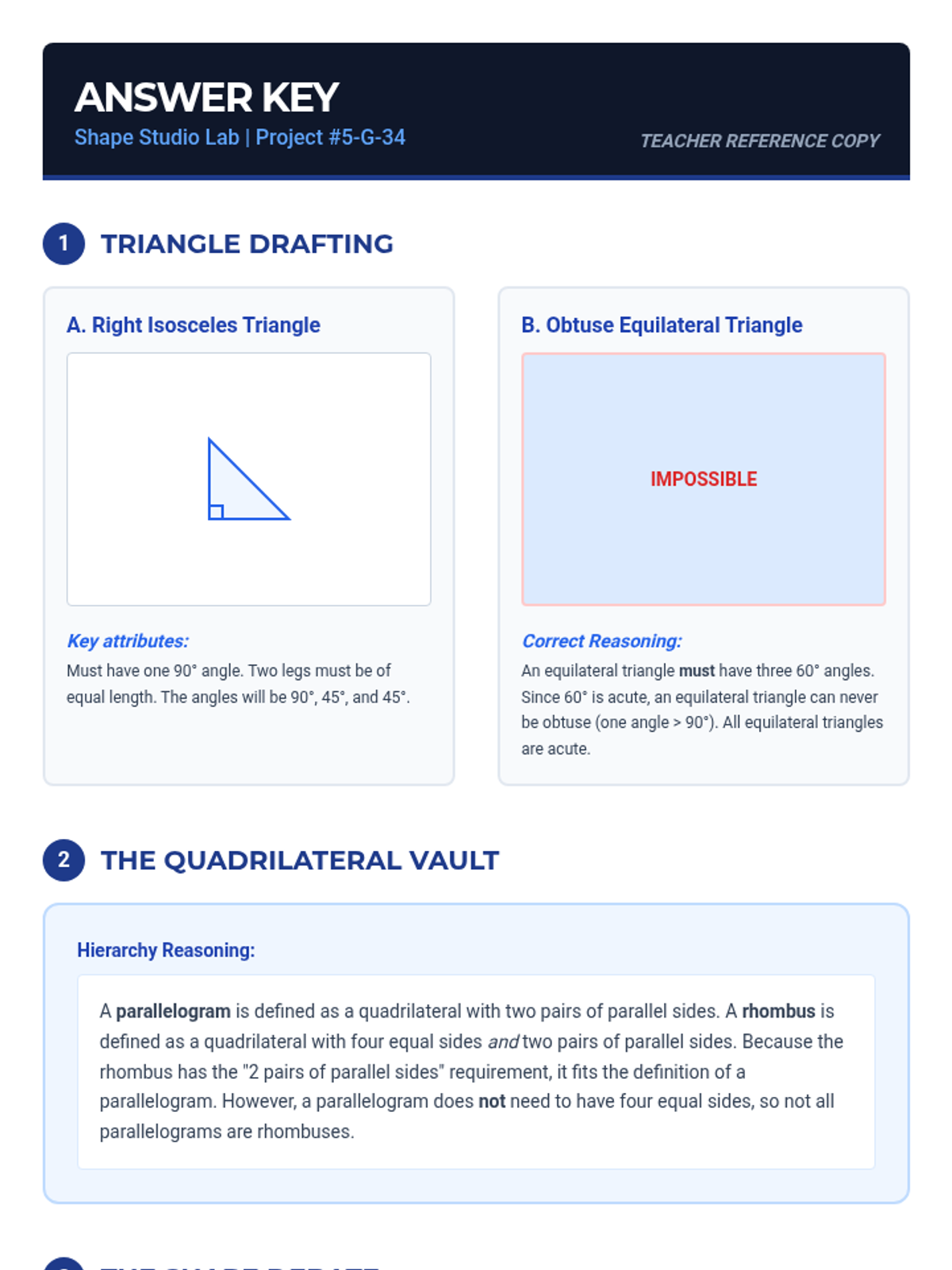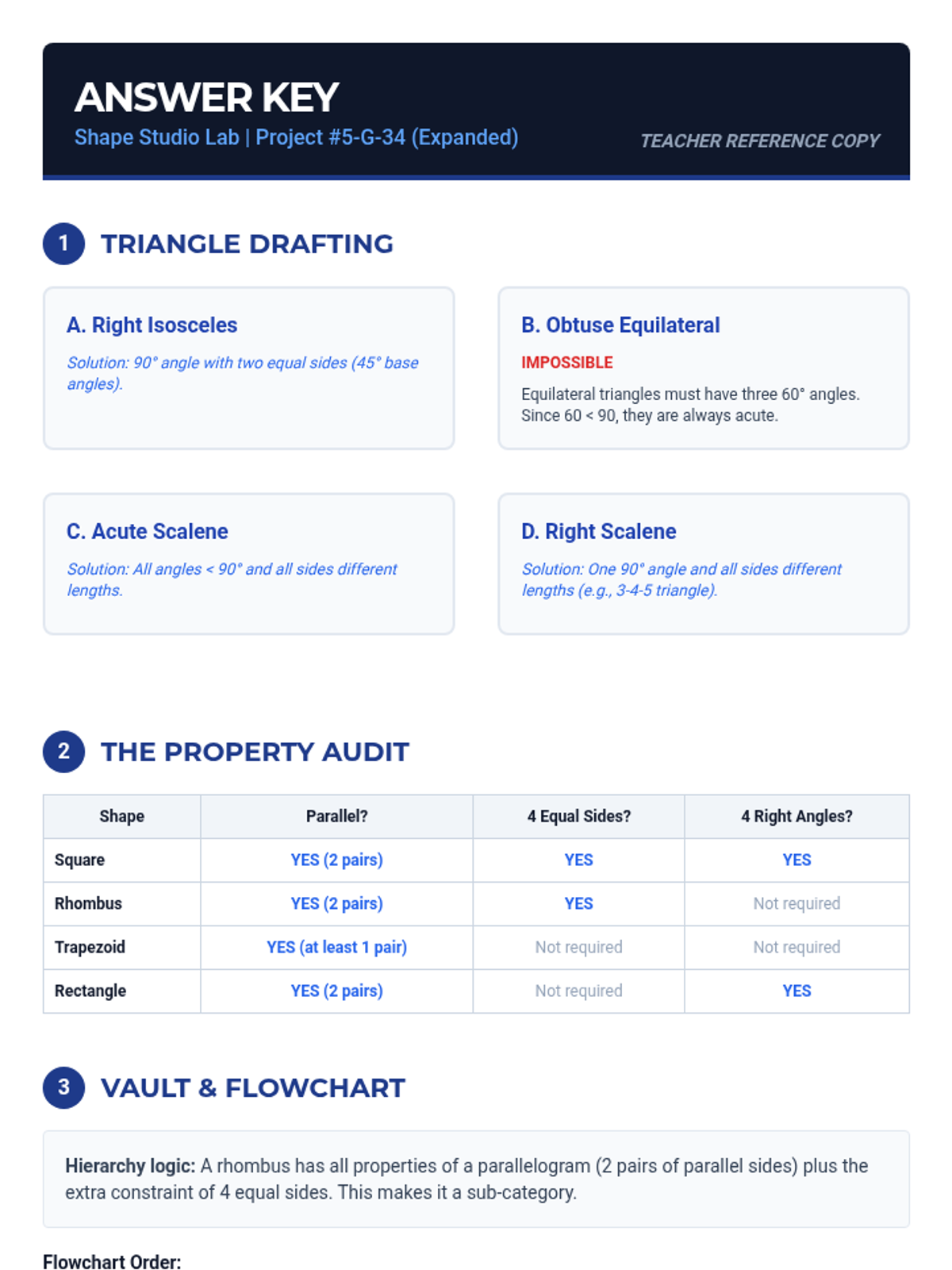 Teacher answer key for the expanded 3-page Shape Studio Worksheet, including correct classifications, hierarchy flowchart logic, and reasoning for the "Impossible Challenge."