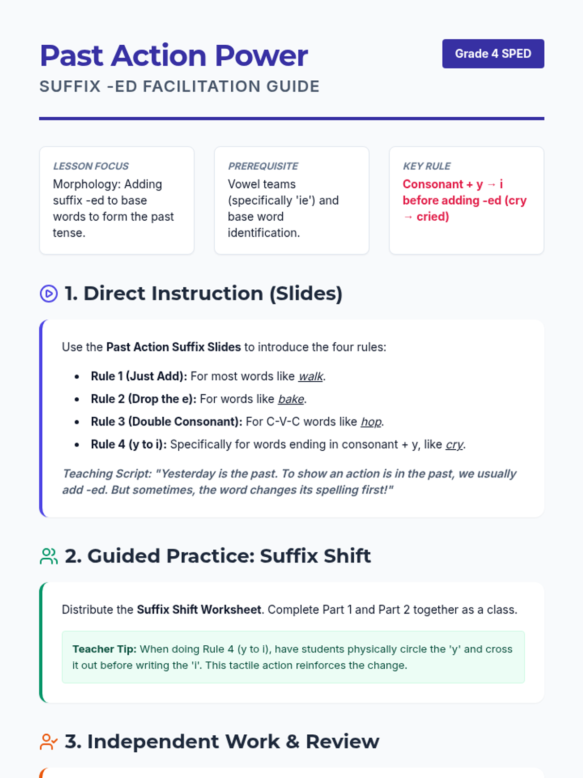 A facilitation guide for Lesson 2 (Past Action Power), providing a teaching script, step-by-step instructional flow, and targeted support strategies for special education students.