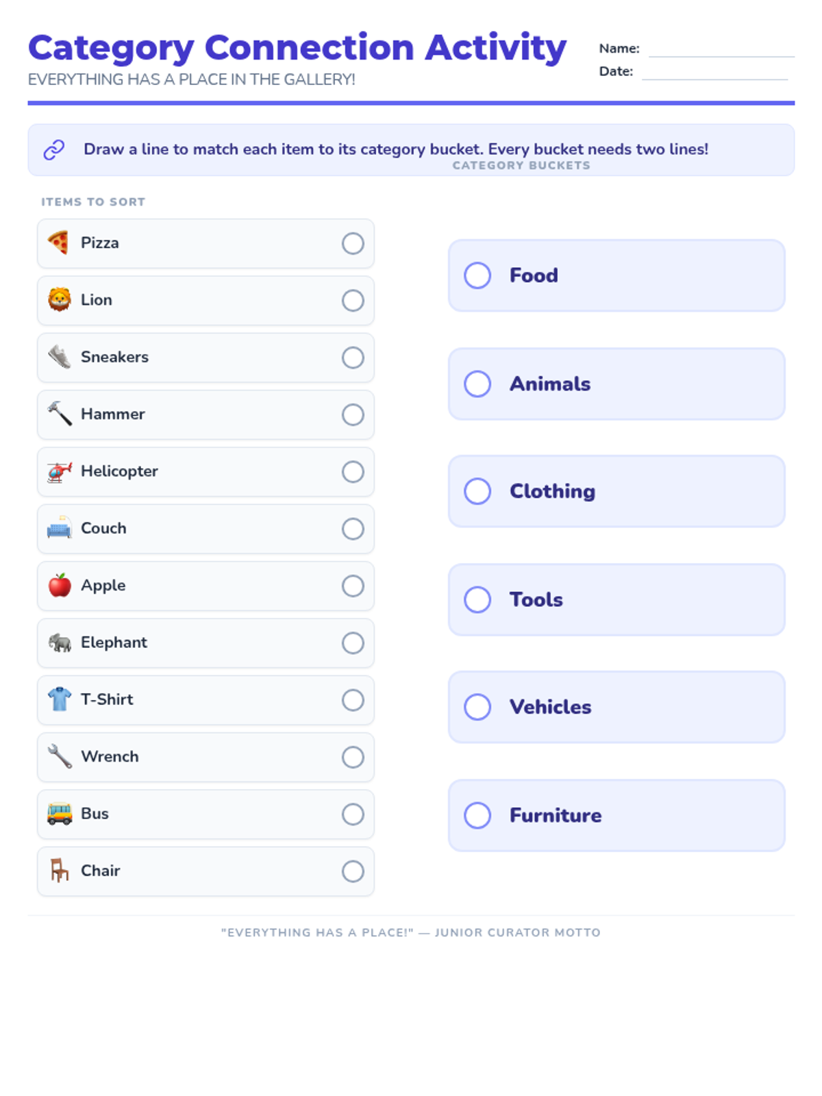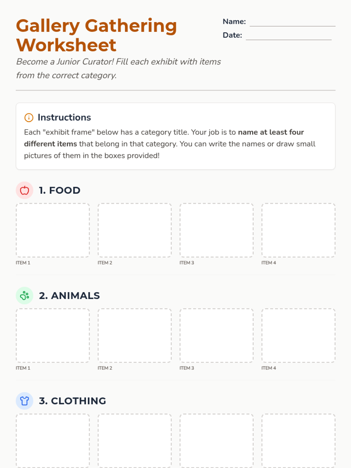 A picture-based worksheet where students name and/or draw four items for each of the six categories. Features a gallery/museum theme with clean exhibit frames for student input. Rebalanced to fit across two pages without splitting categories.