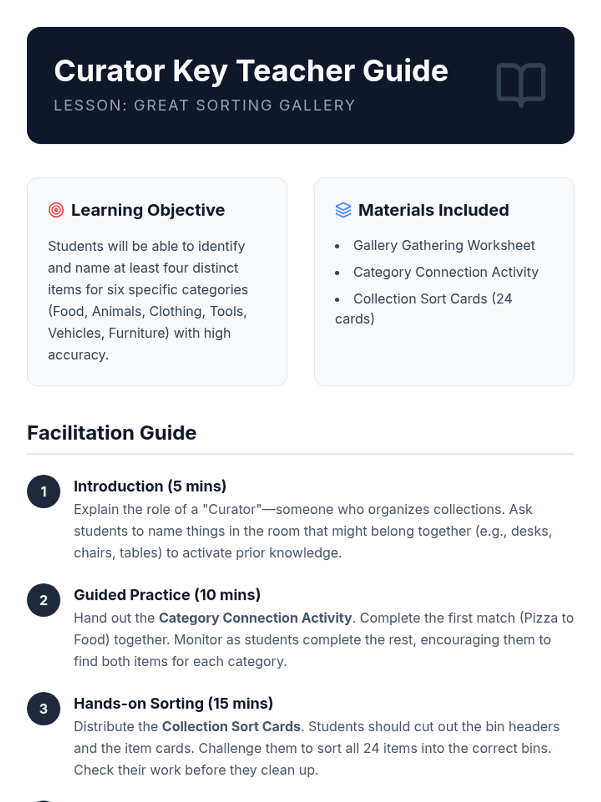 A comprehensive guide for teachers including lesson objectives, a step-by-step facilitation guide, answer keys, differentiation tips, and extension activities. Rebalanced to eliminate orphaned text.