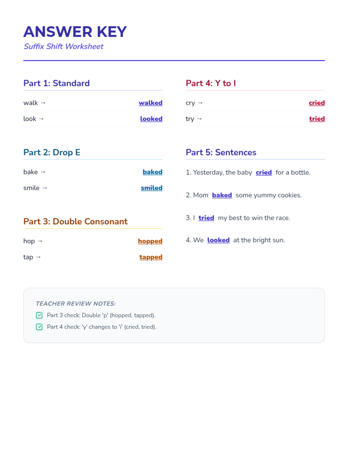 The answer key for the Suffix Shift worksheet, providing correct transformations and completed sentences for teacher reference.