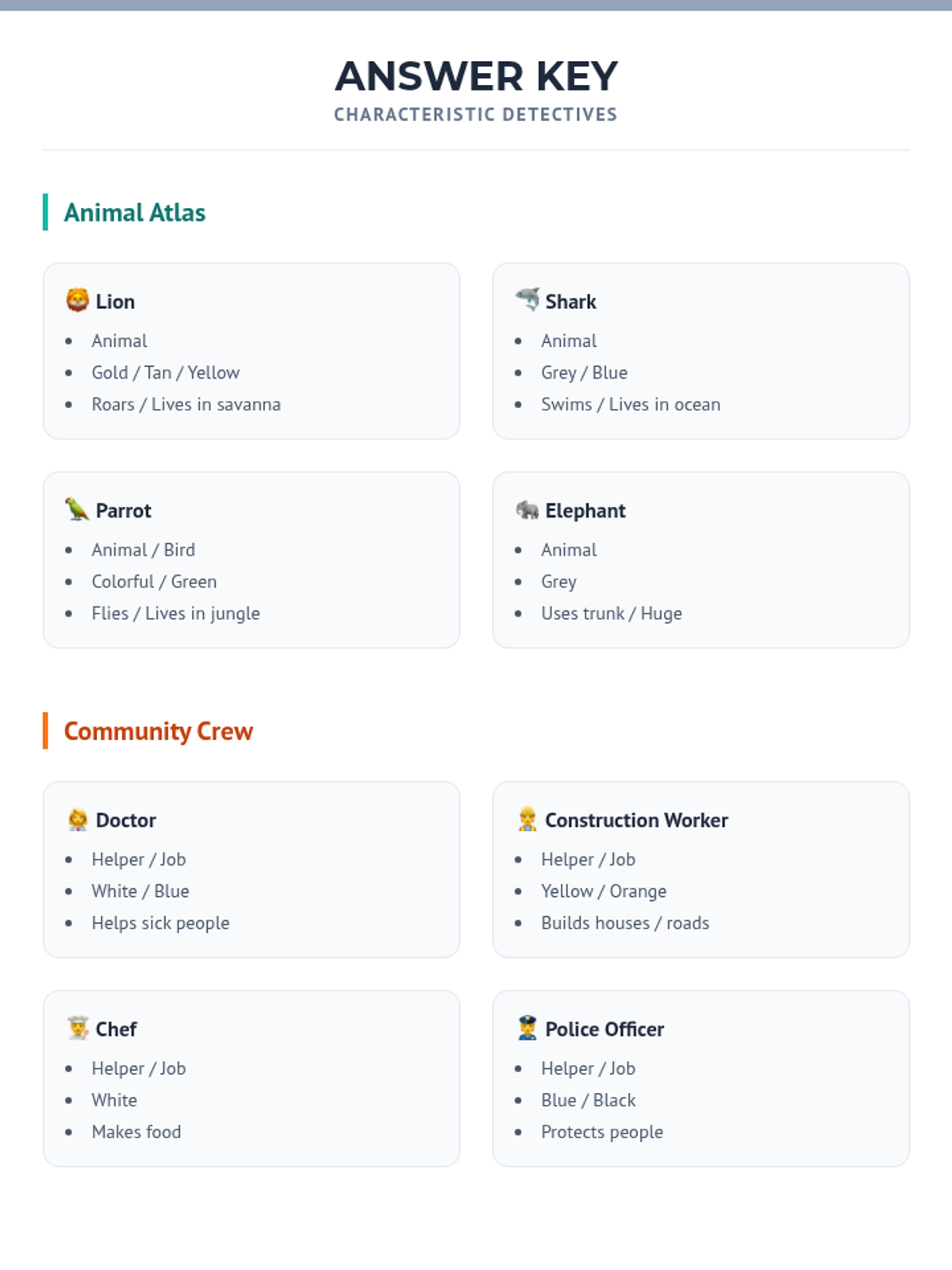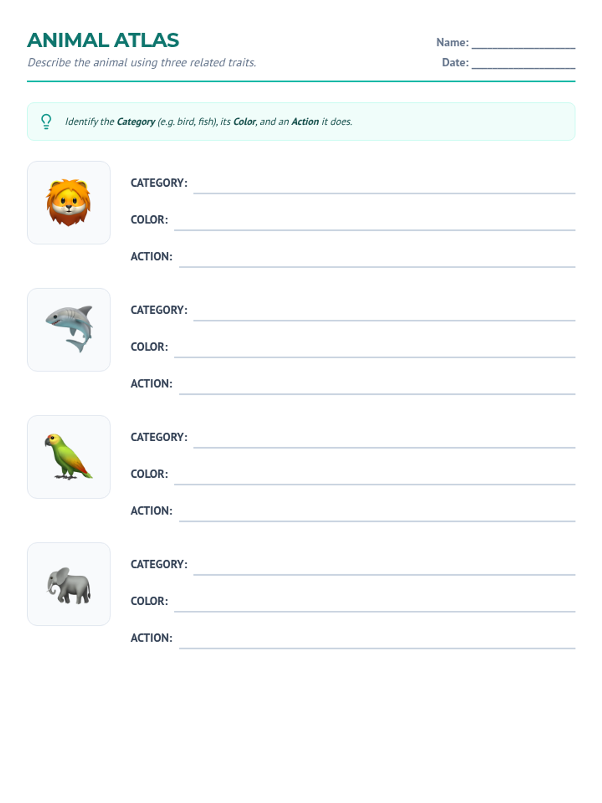 A worksheet where students identify the category, color, and action/function for various animals including a lion, shark, parrot, and elephant.