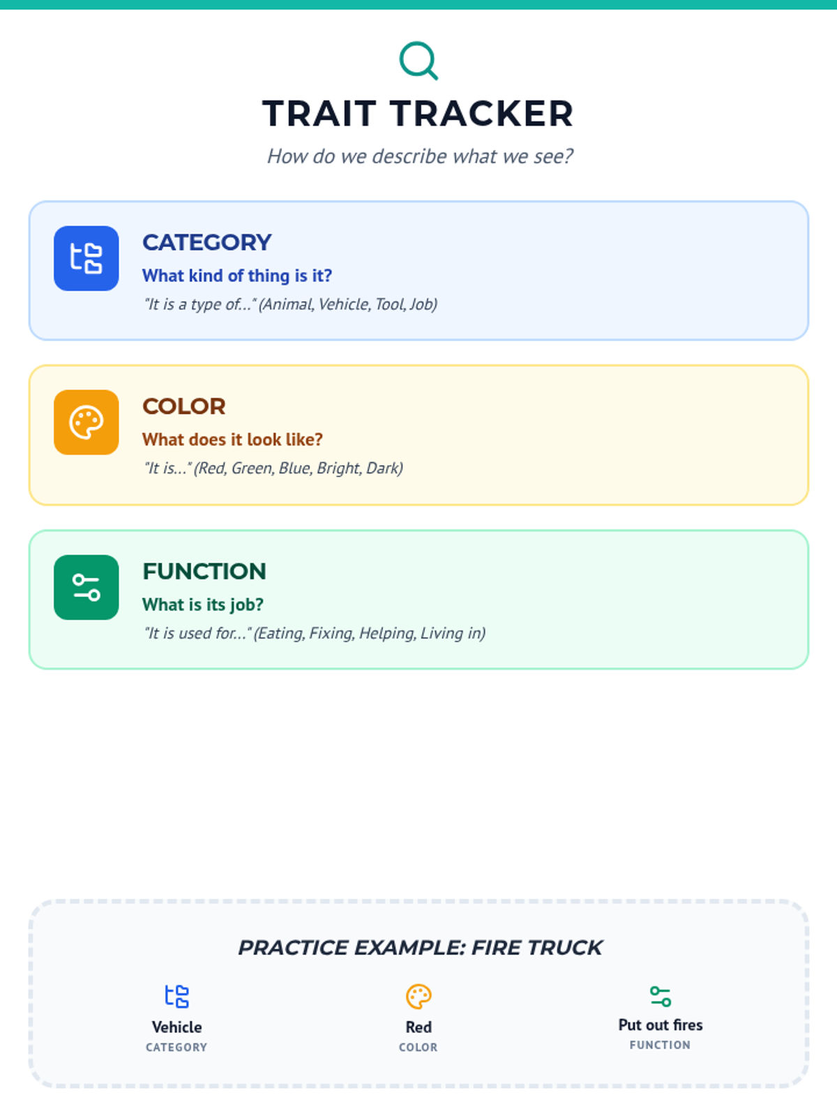 A visual anchor chart defining the 'Big Three' characteristics (Category, Color, Function) with icons and examples to help students describe objects.