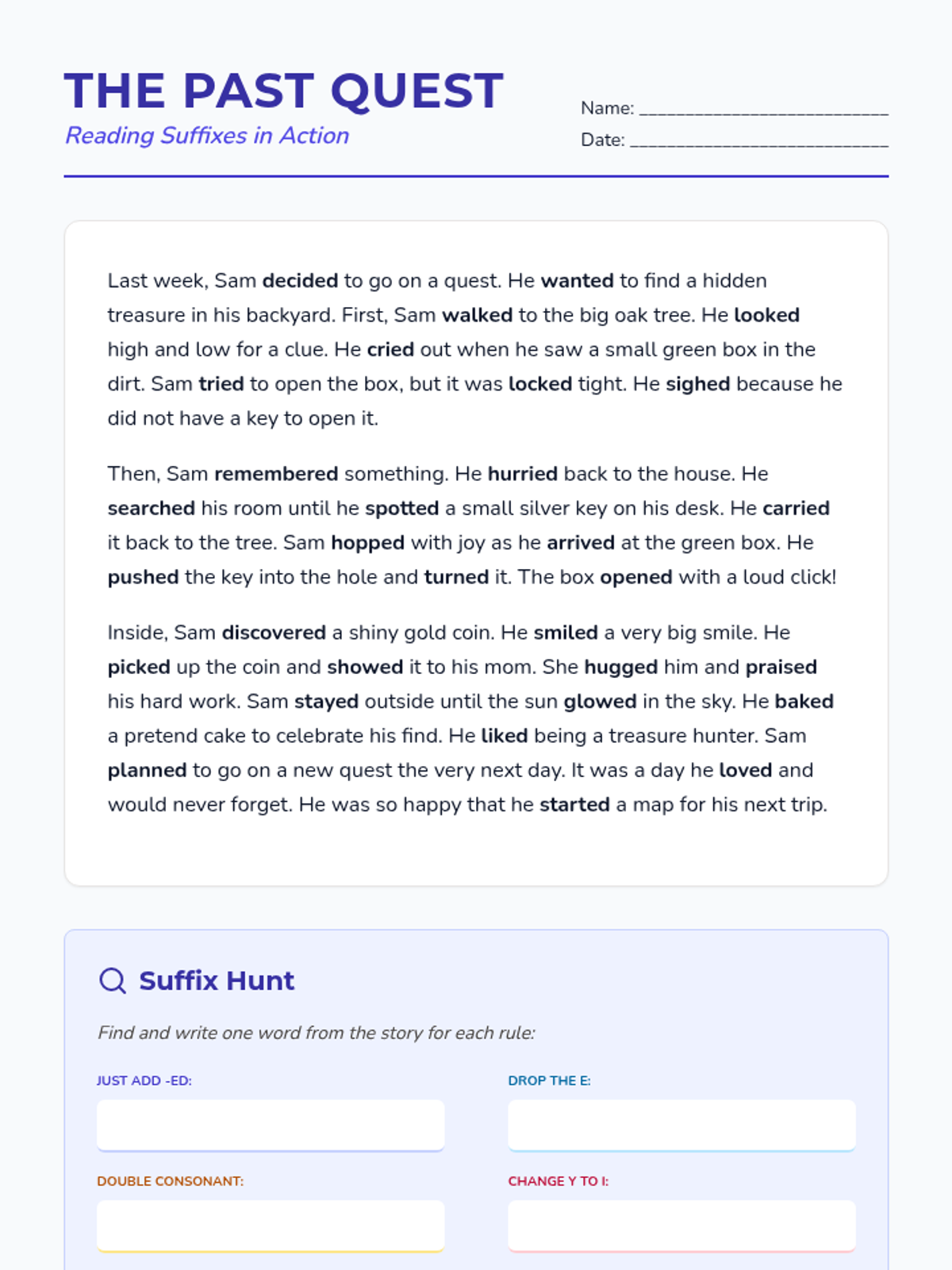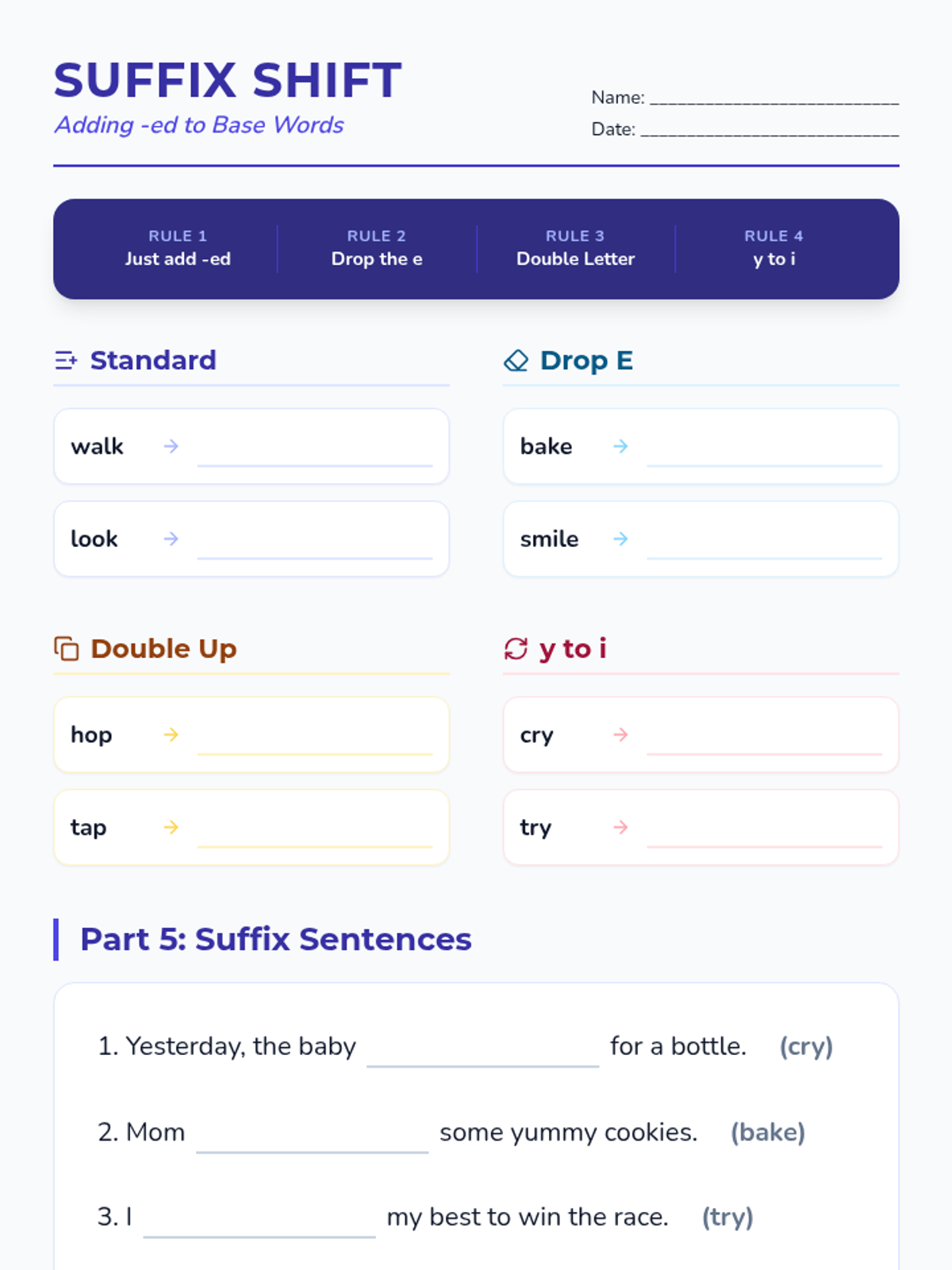 A practice worksheet for adding the -ed suffix to base words, organized by rule type with a special section for the y-to-i change and sentence-level application.