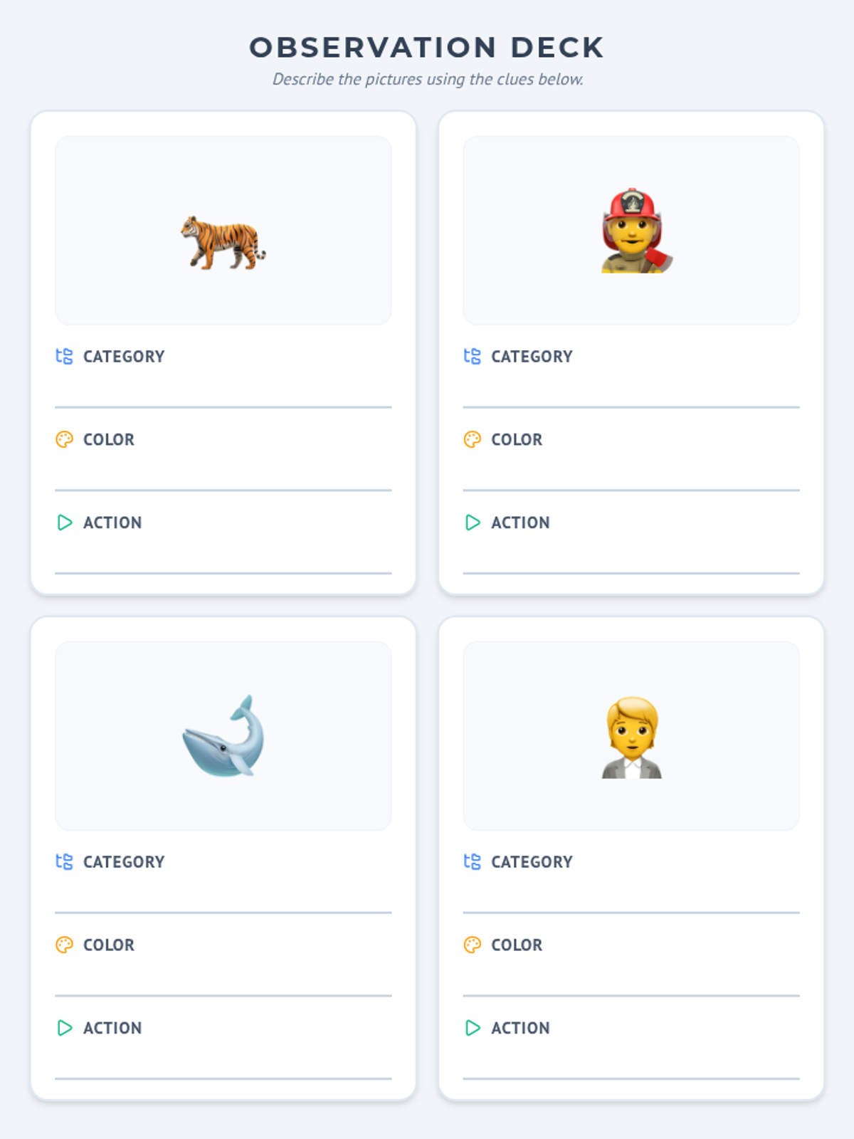 Vocabulary flashcards for a tiger, firefighter, whale, and mail carrier, each with icon-coded spaces to name category, color, and function.