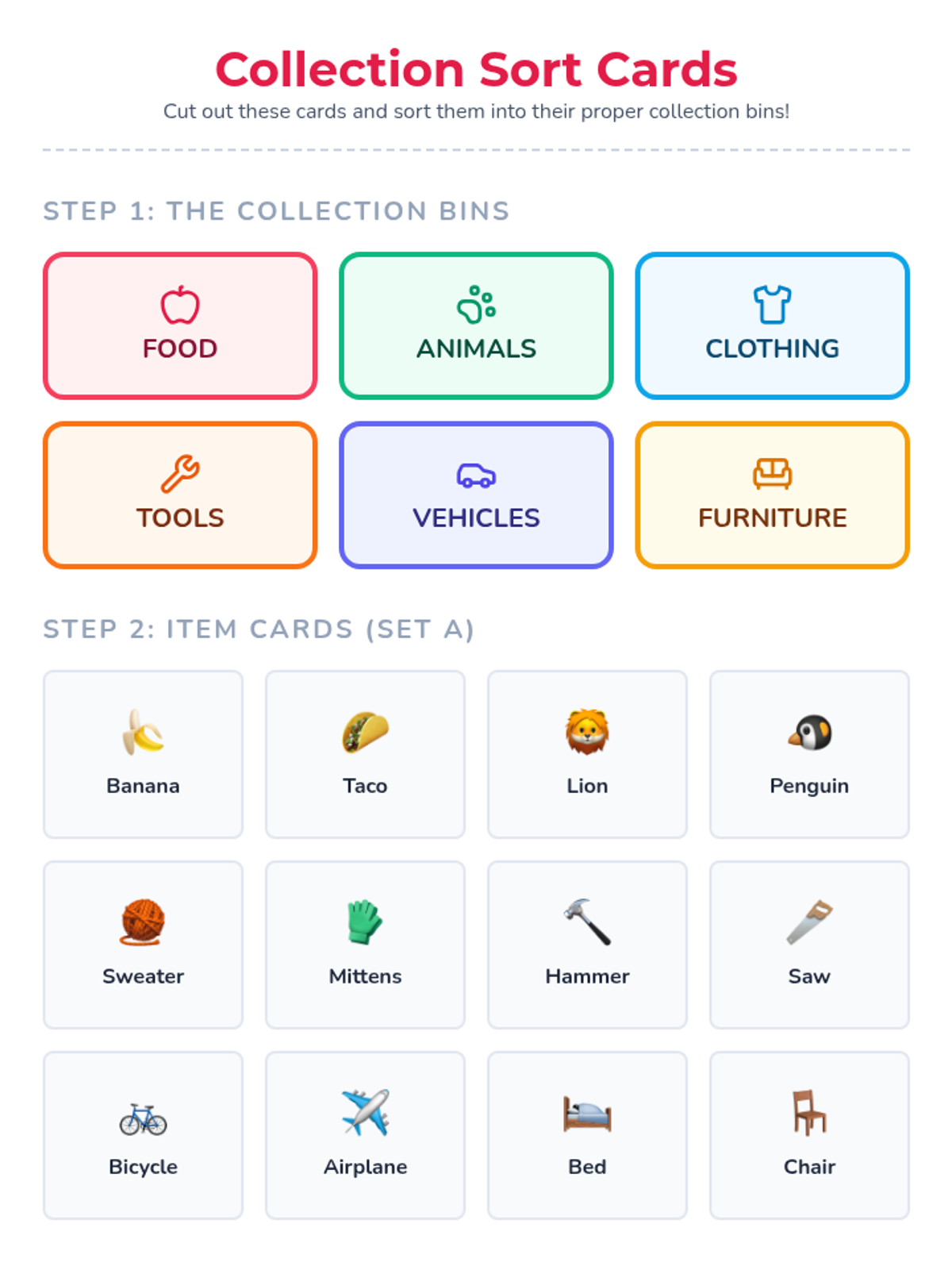 A set of printable sorting cards featuring 24 vocabulary words with icons and 6 category "bin" cards. Redesigned to avoid cutting cards across page breaks and added icons for 3rd-grade engagement.