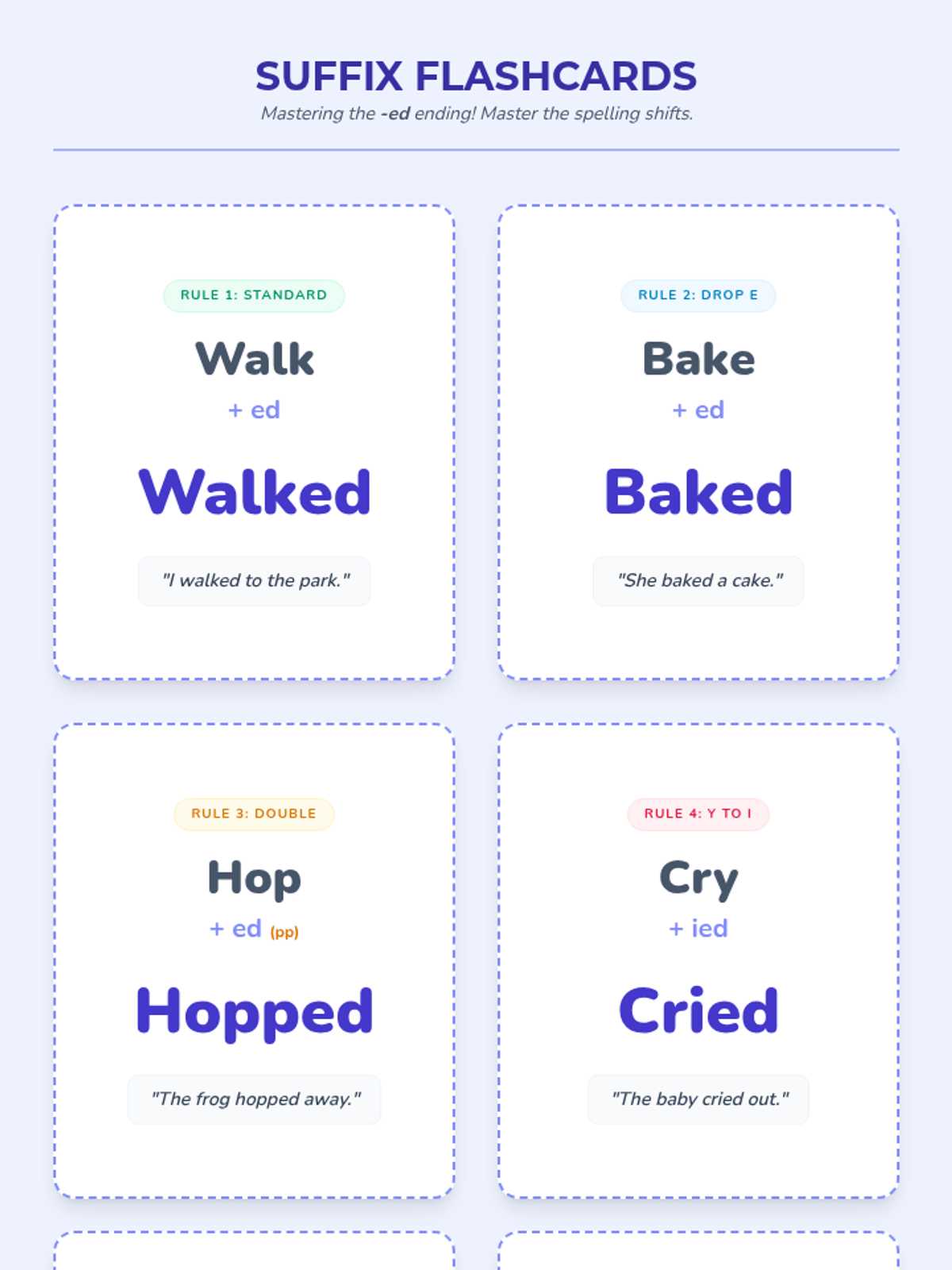 A set of suffix -ed flashcards for Lesson 2, demonstrating the four spelling rules with examples and practice game ideas.