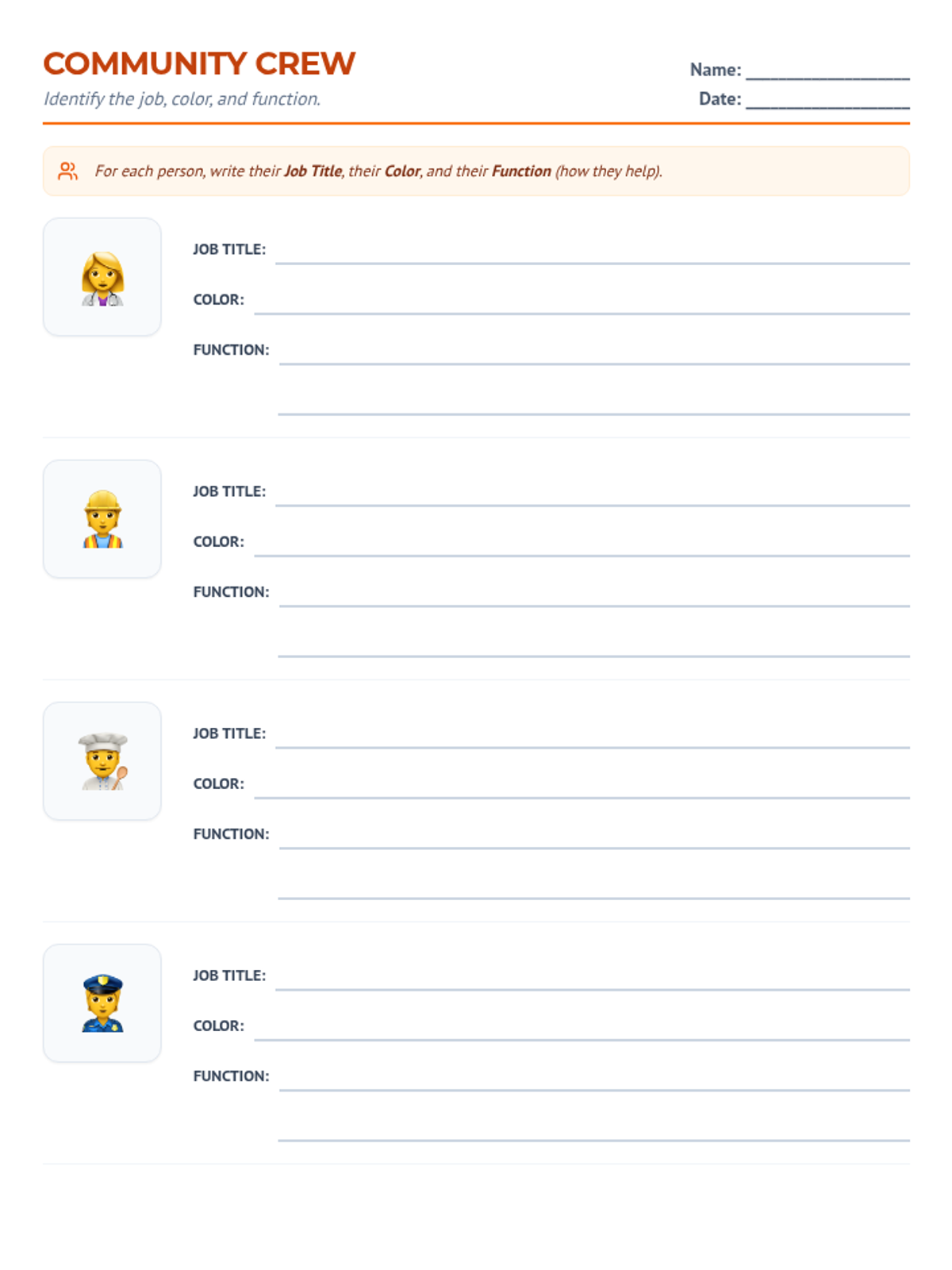 A worksheet where students identify the job title, uniform color, and job function for community helpers like a doctor, construction worker, chef, and police officer.
