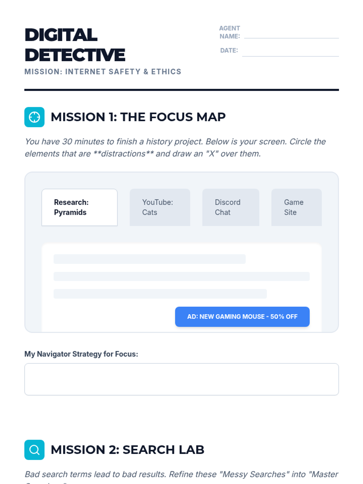 A scenario-based worksheet where middle schoolers practice identifying distractions, refining search terms, and spotting online communication red flags. Corrected for page breaks and marking area size.