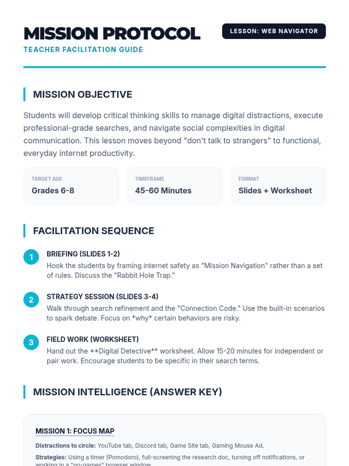 A comprehensive facilitation guide for teachers, including pacing instructions, discussion prompts, and an answer key for the student worksheet. Corrected for page breaks and internal layout.