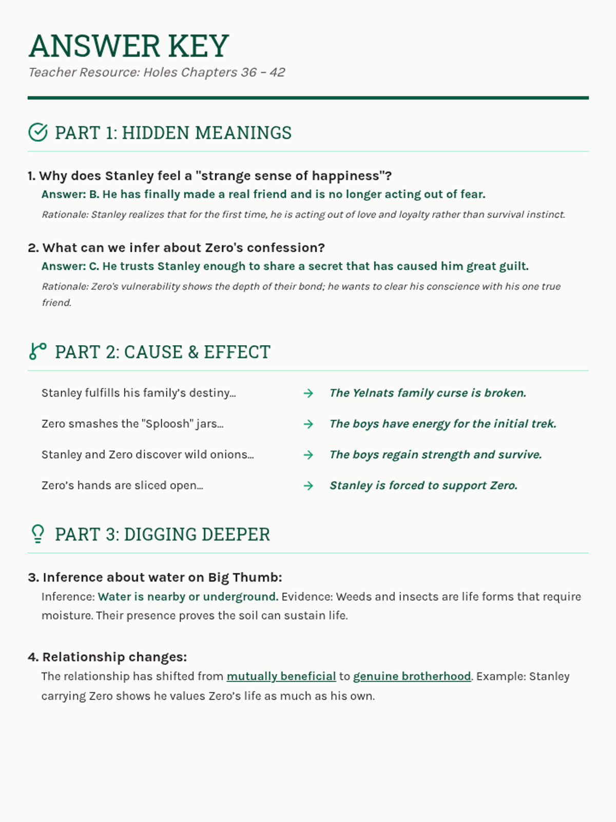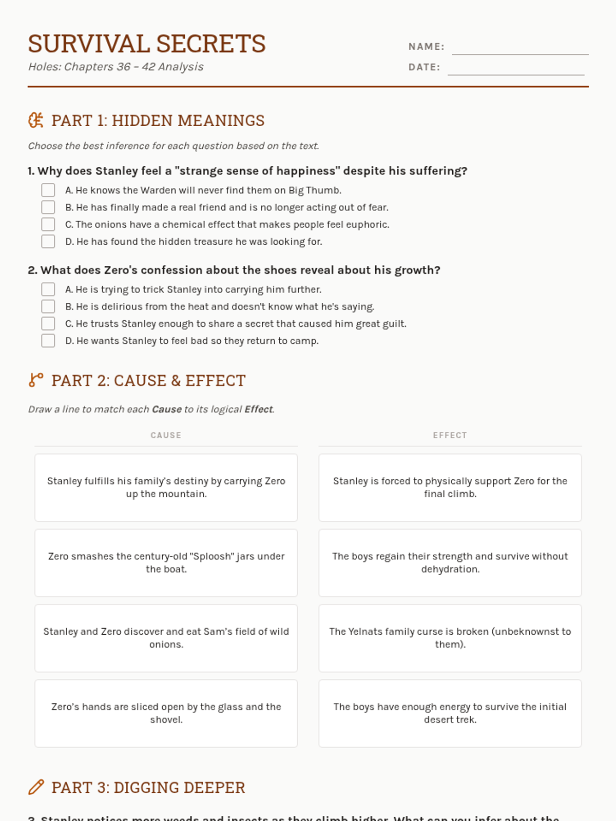 A student worksheet for Holes Chapters 36-42, featuring inferencing multiple-choice questions, cause-and-effect matching, and short-answer prompts about the Big Thumb climb.