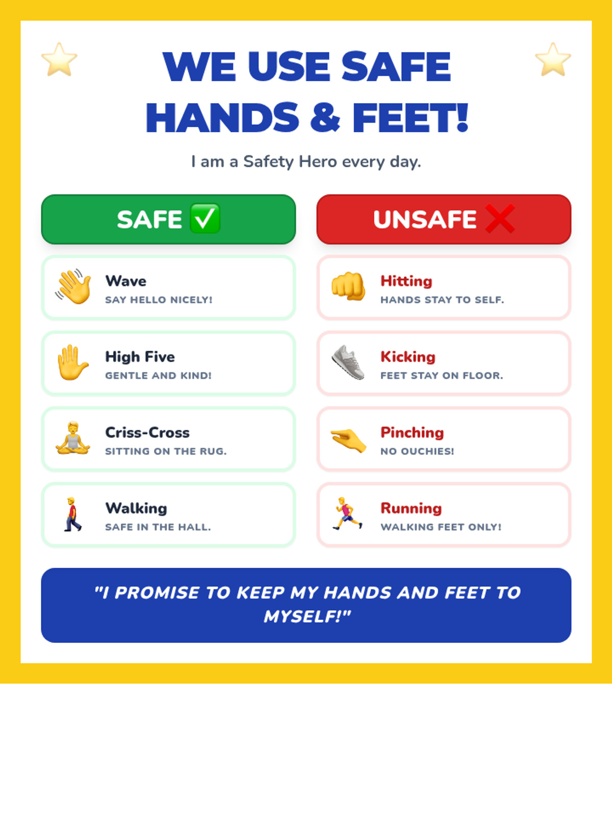 A bright classroom anchor chart visual that clearly defines and illustrates safe versus unsafe uses of hands and feet. Redesigned to fit within a single page and ensure high contrast.
