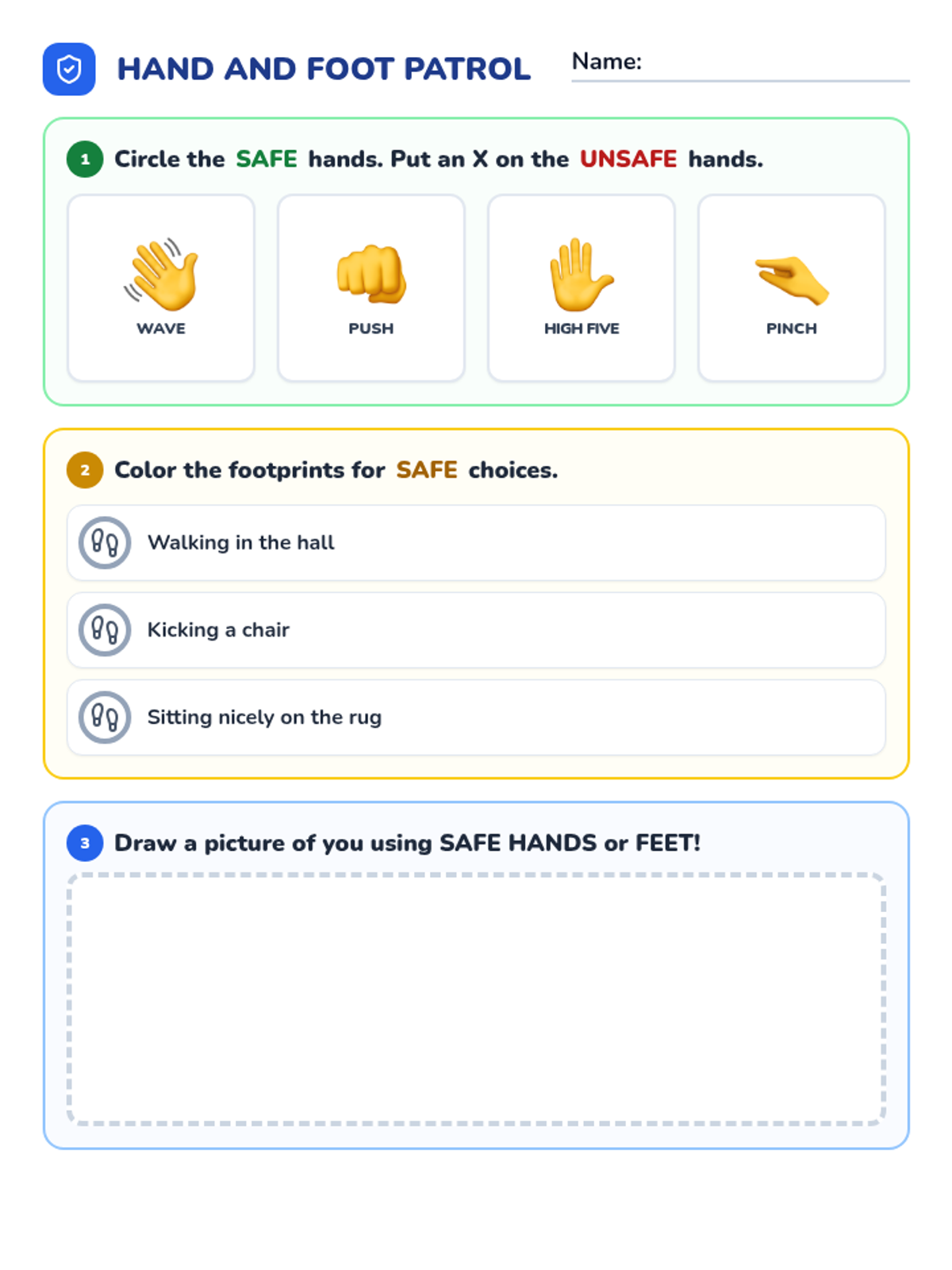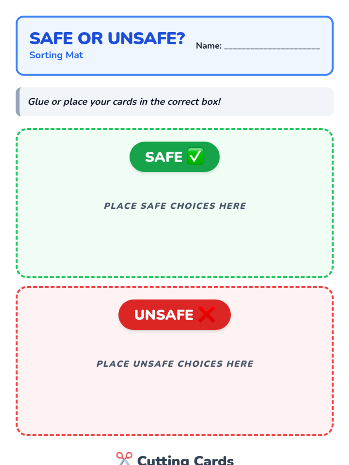 A sorting activity for kindergarteners featuring cards with various hand and foot behaviors to be classified as "Safe" or "Unsafe". Includes separate sorting mats and cutting cards with dashed lines.