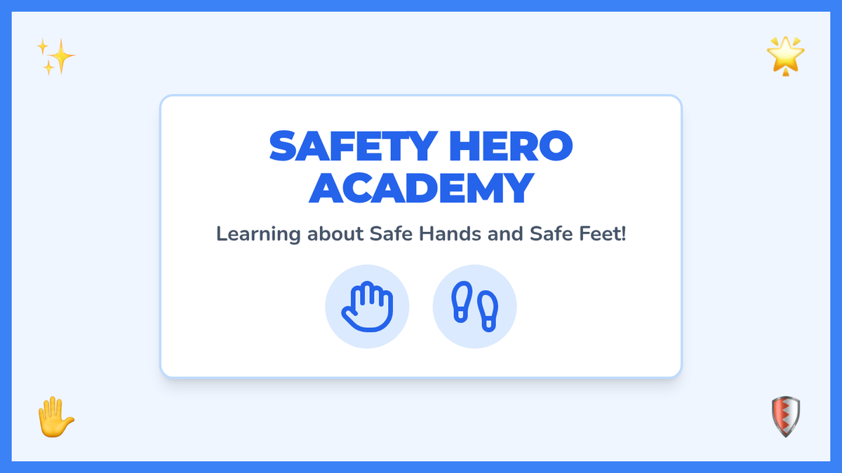Engaging slides for kindergarteners that introduce the concepts of "Safe Hands" and "Safe Feet" through simple visuals, contrast between safe and unsafe behaviors, and a promise activity.
