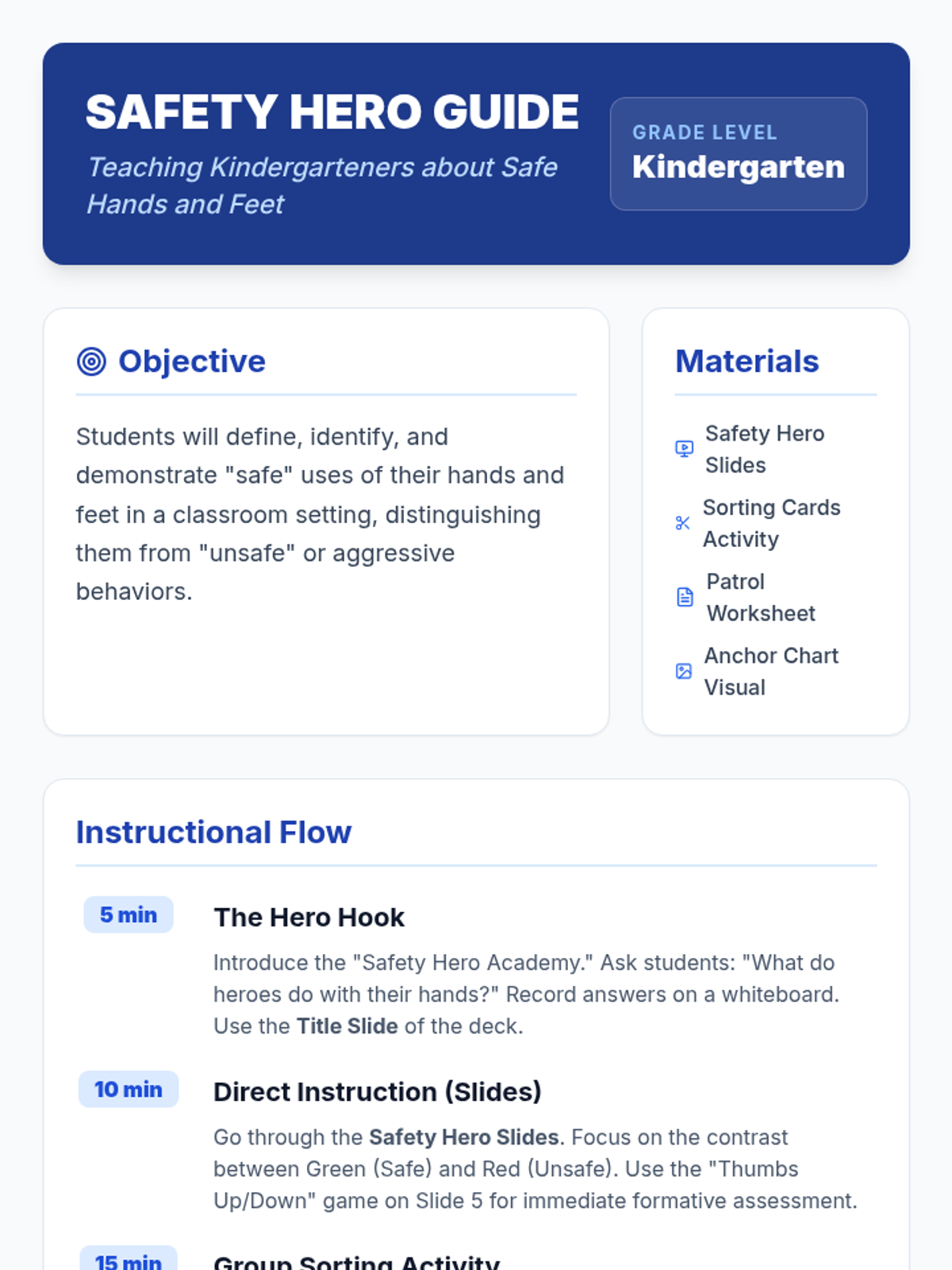 A comprehensive teacher's guide for the Safety Hero lesson, including lesson objectives, a pacing guide, talking points, and differentiation strategies.
