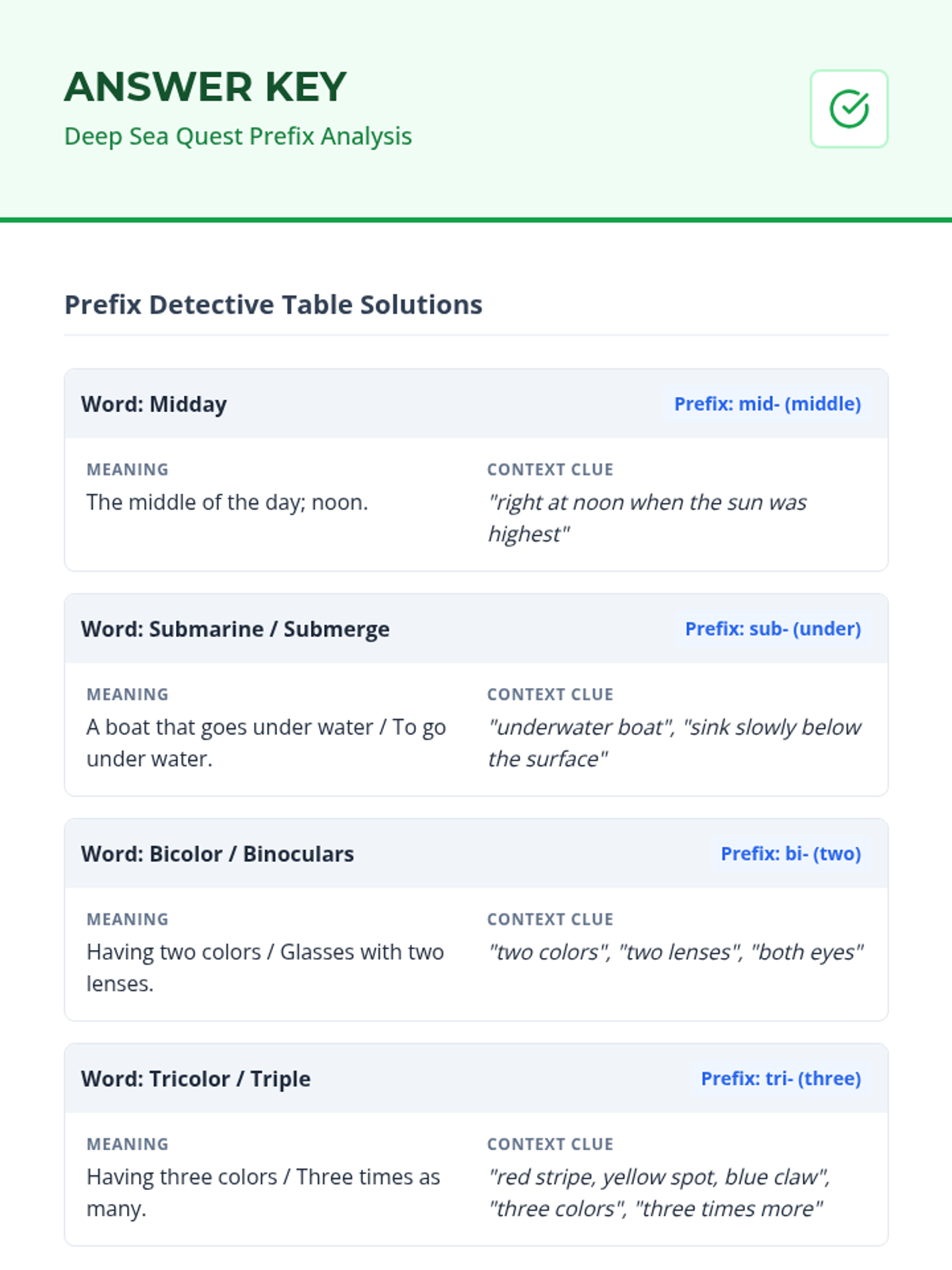 A comprehensive answer key and teaching guide for the 'Deep Sea Quest' story, providing clear definitions and identifying the specific context clues used for prefixes bi-, tri-, sub-, and mid-.
