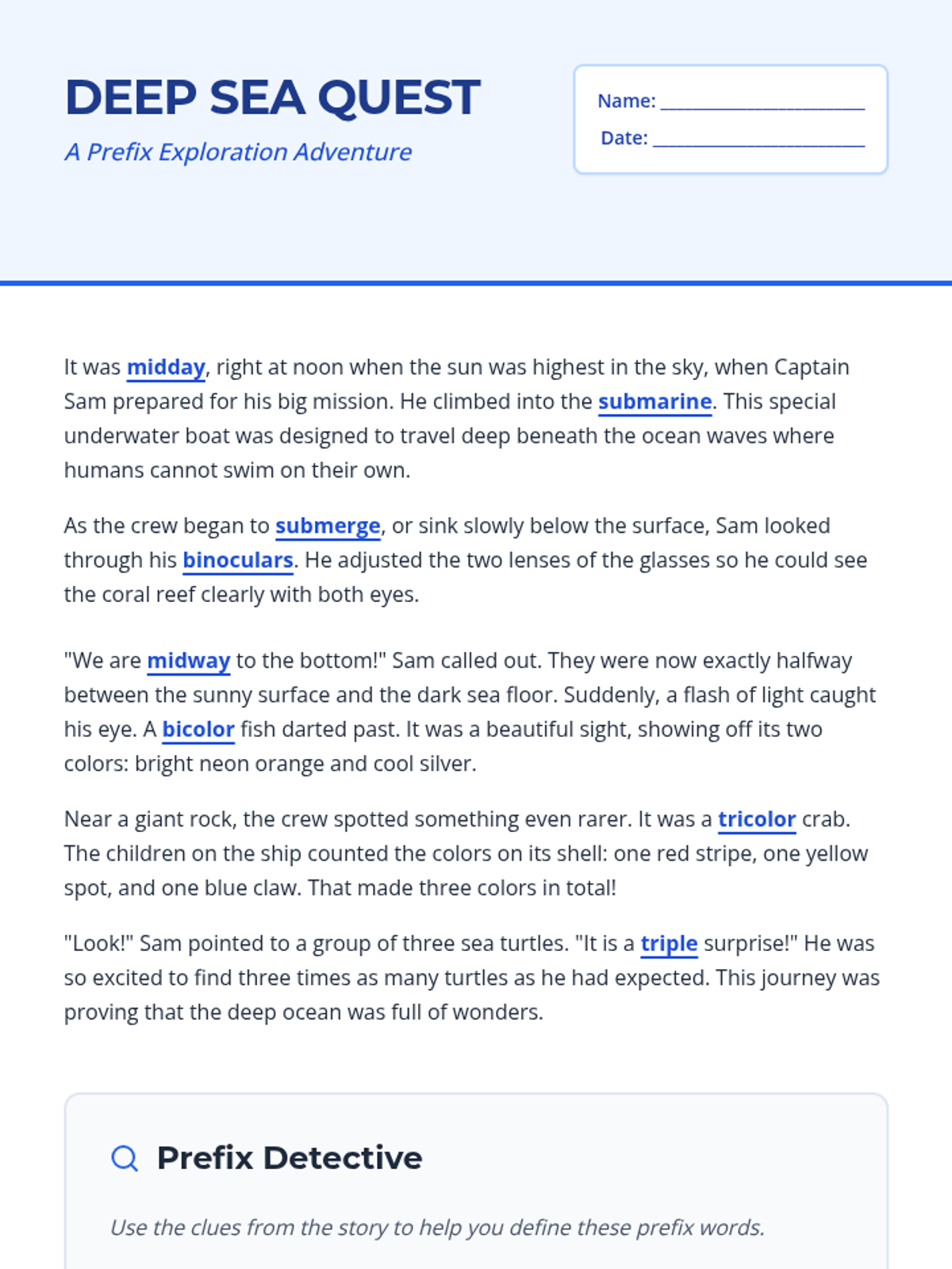 A 3rd-grade reading passage titled 'Deep Sea Quest' that integrates prefixes (bi-, tri-, sub-, mid-) with context clues. Includes a 'Prefix Detective' worksheet section for students to define the words based on the text.