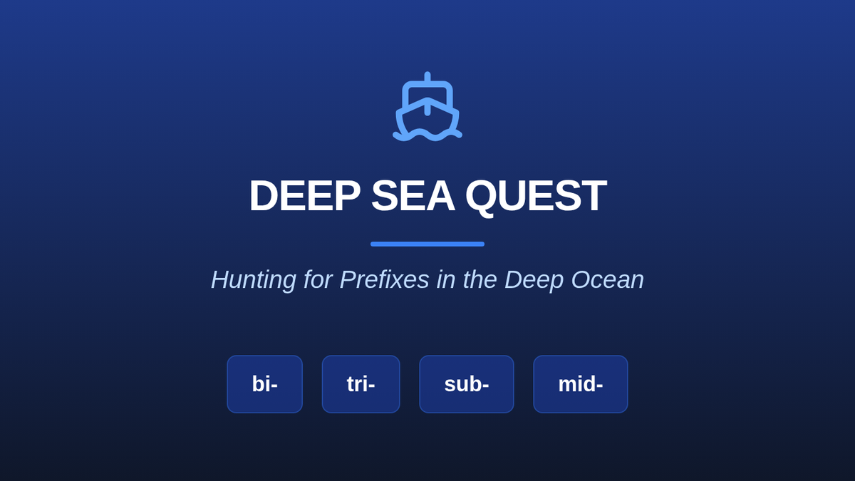 A visual slide presentation designed for 3rd-grade prefix instruction. Covers bi-, tri-, sub-, and mid- with clear definitions, examples, and discussion questions to complement the 'Deep Sea Quest' story.
