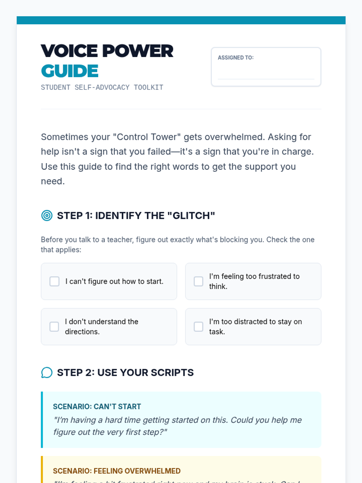A student self-advocacy guide titled 'Voice Power Guide' that provides middle schoolers with scripts and templates for communicating their executive functioning needs to teachers.