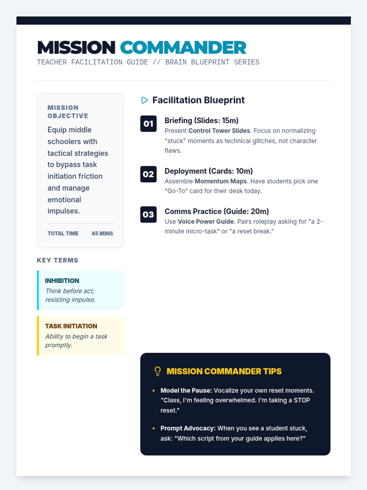 A teacher facilitation guide titled 'Mission Commander' that provides educators with instructions, tips, and key concepts for implementing the Brain Blueprint executive functioning toolkit.