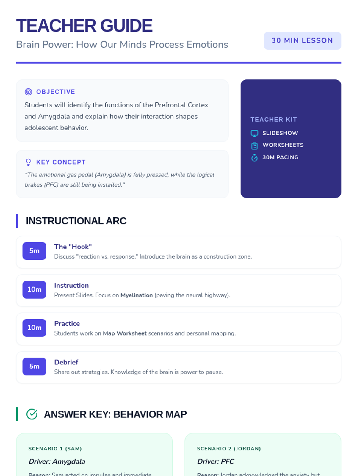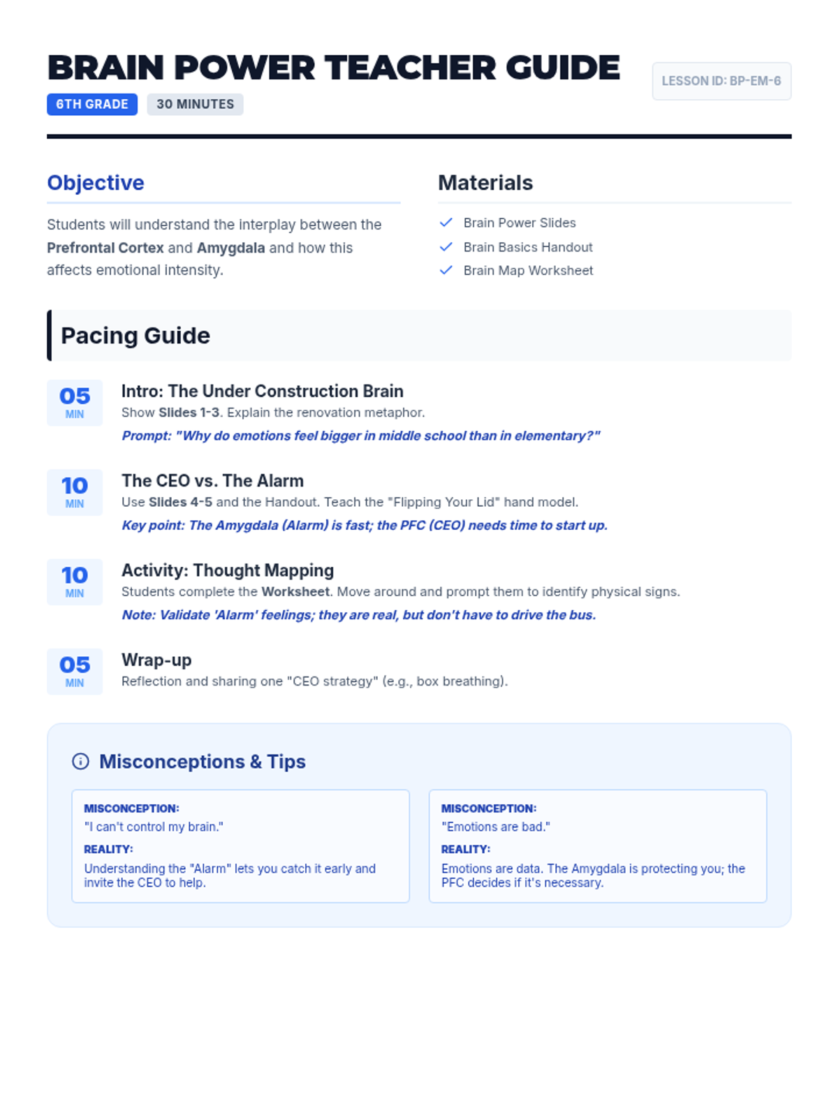 A comprehensive teacher's guide for the 30-minute "Brain Power" lesson. Includes a detailed pacing guide, instructional strategies for the hand model metaphor, and notes on common 6th-grade misconceptions about brain development.