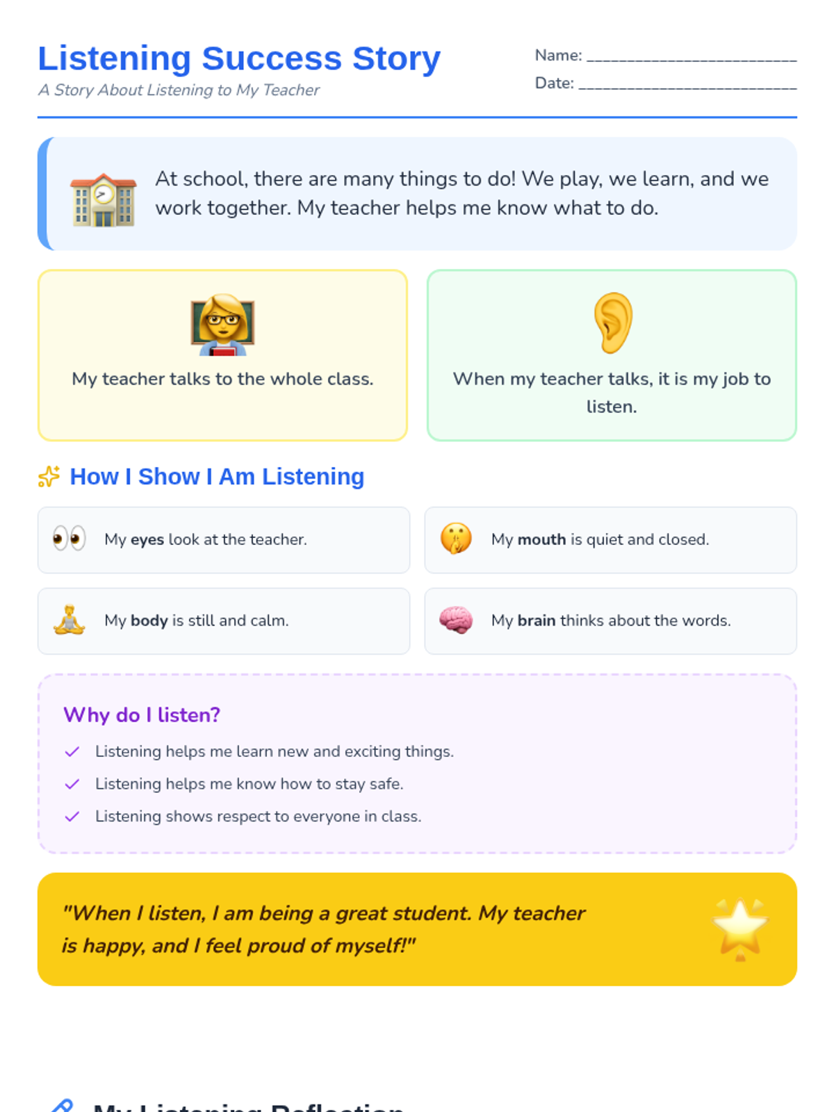 A social story document that uses simple language and illustrative icons to explain why and how students should listen to their teacher. Includes a student reflection section.
