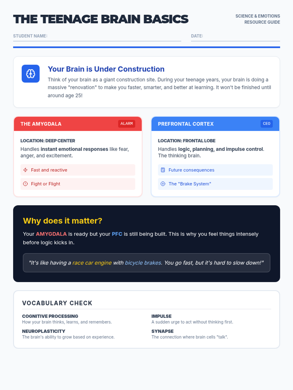A reference handout for 6th-grade students explaining the basic anatomy of the adolescent brain, focusing on the prefrontal cortex and amygdala. Includes a vocabulary section and conceptual metaphors for brain development.
