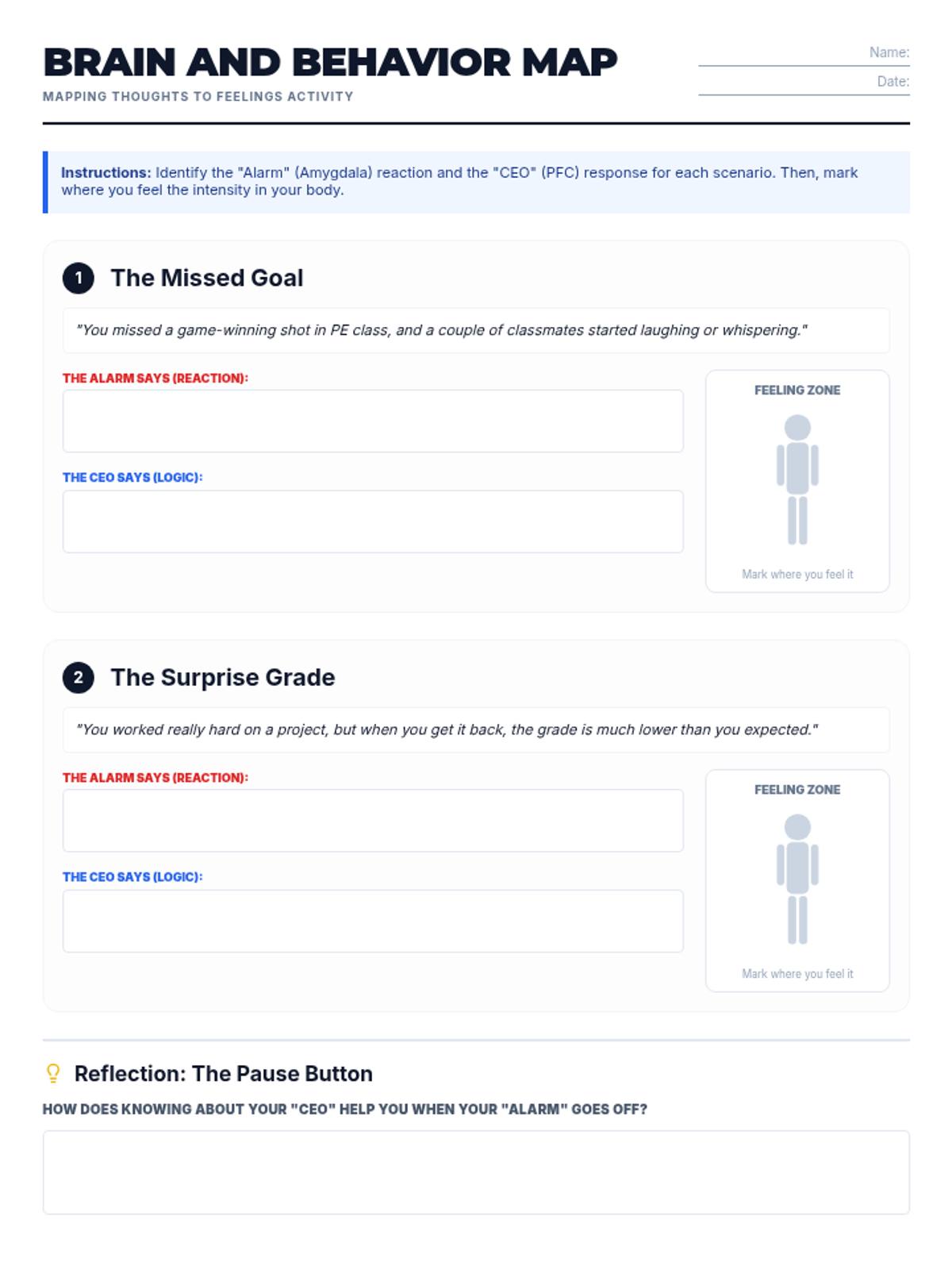 A 6th-grade worksheet for mapping brain responses to emotional scenarios. Students differentiate between reactive "Alarm" (amygdala) responses and logical "CEO" (prefrontal cortex) responses, while also identifying physical sensations of emotions.