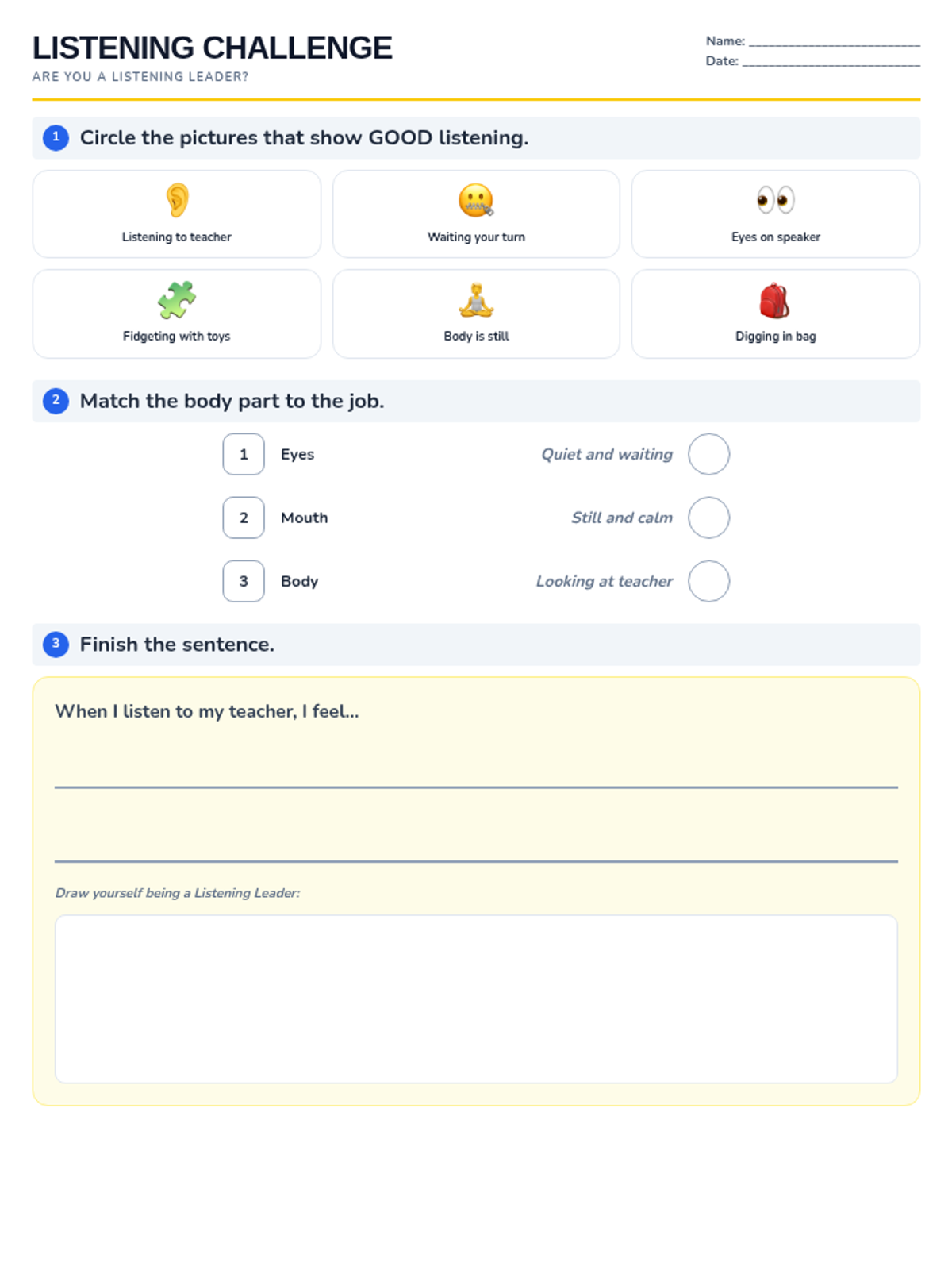 A student worksheet featuring multiple-choice identification, a matching activity for 'Whole Body Listening', and a creative reflection section.