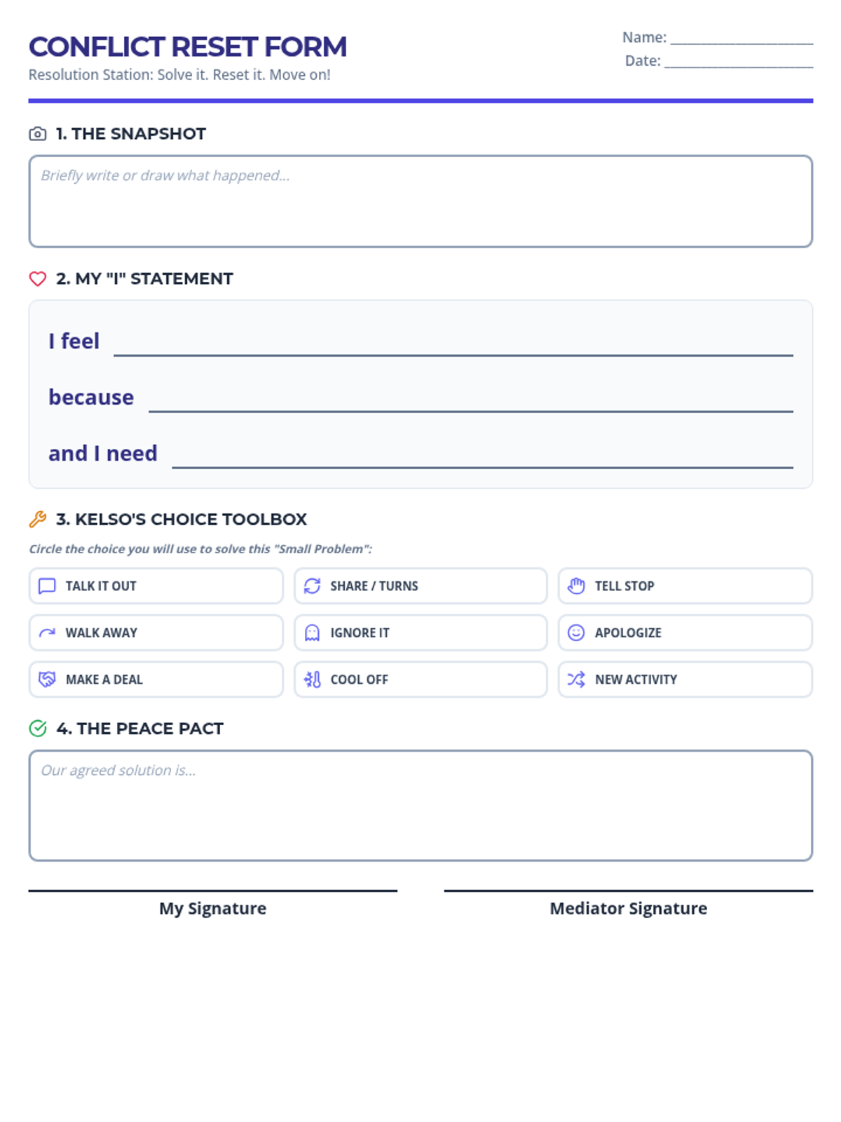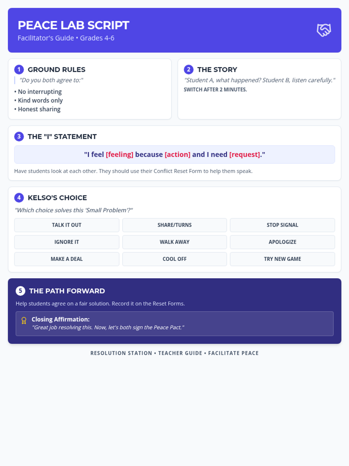 A structured, step-by-step mediation script for teachers or peer mediators to guide students through conflict resolution using 'I' statements and Kelso's Choices. Condendsed to fit on a single page for easy classroom use.