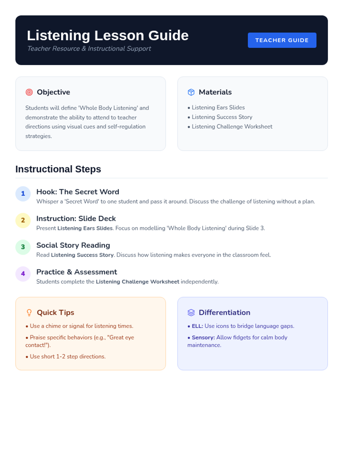 A comprehensive guide for teachers on how to deliver the 'Listening Leaders' lesson, including a hook activity, step-by-step instructions, and differentiation strategies.