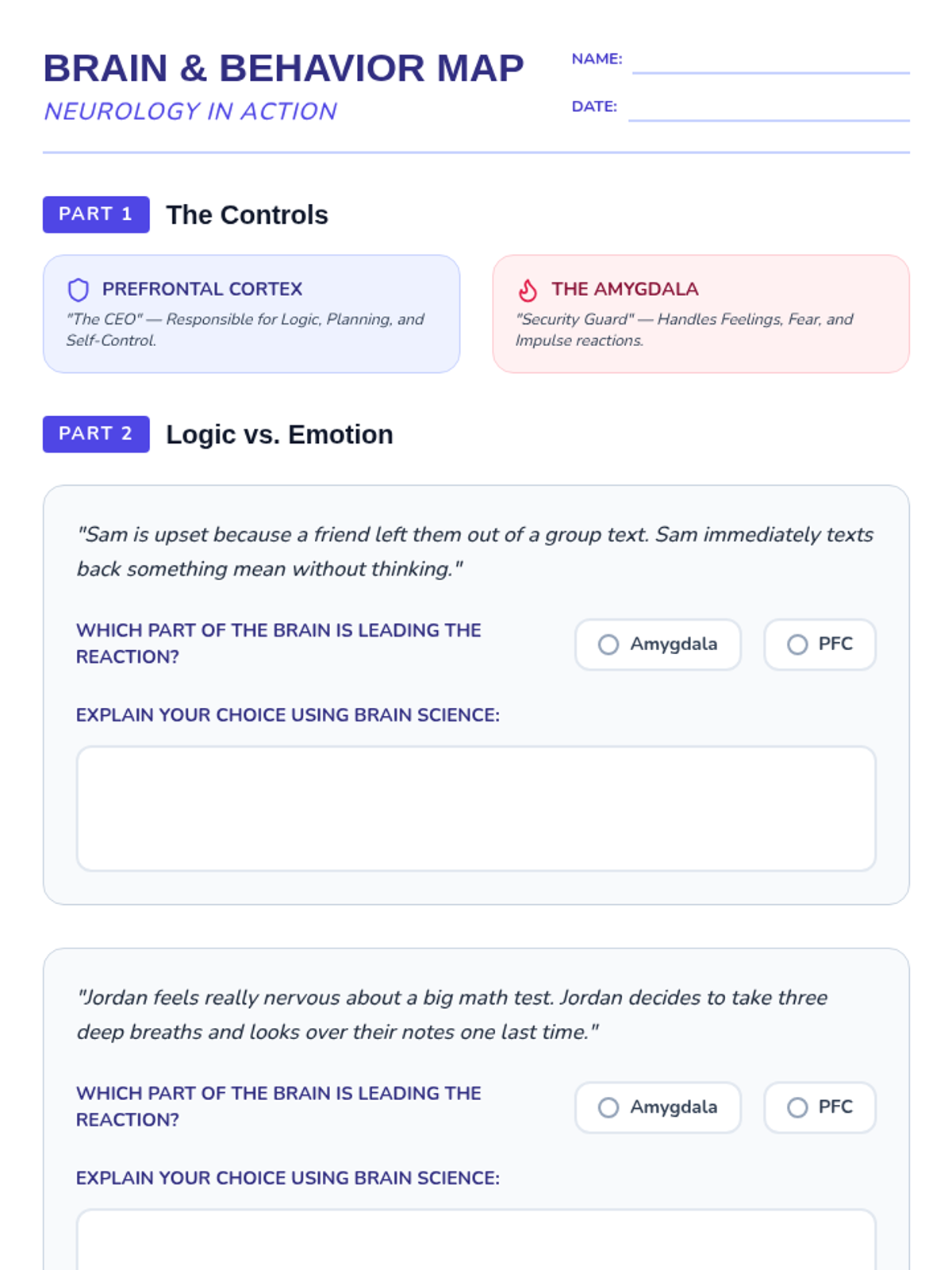 An activity sheet for 6th grade students to analyze behavioral scenarios and identify whether responses are driven by the amygdala or the prefrontal cortex.