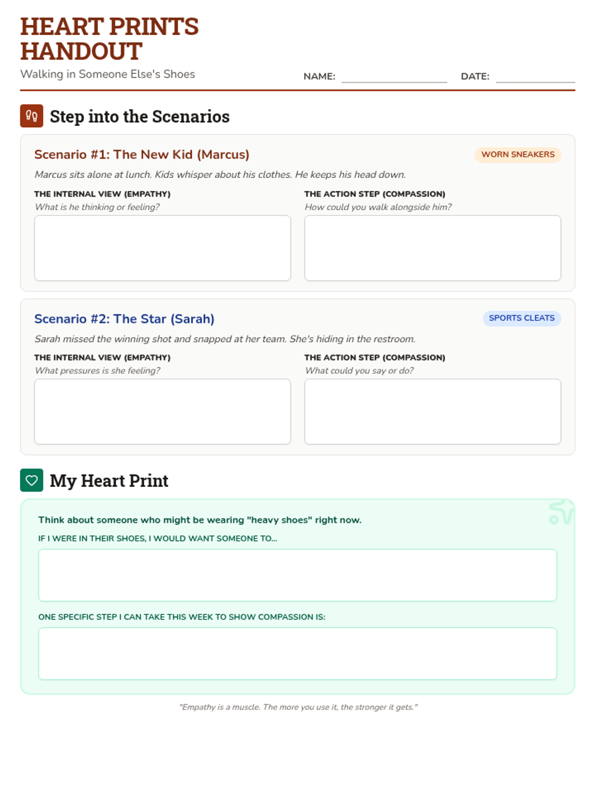 A student worksheet for the 'Soul Soles' empathy lesson. It provides two case studies with analysis questions for perspective-taking (empathy) and action-planning (compassion), plus a personal reflection section for students to commit to a compassionate act. Optimized for a single-page layout.