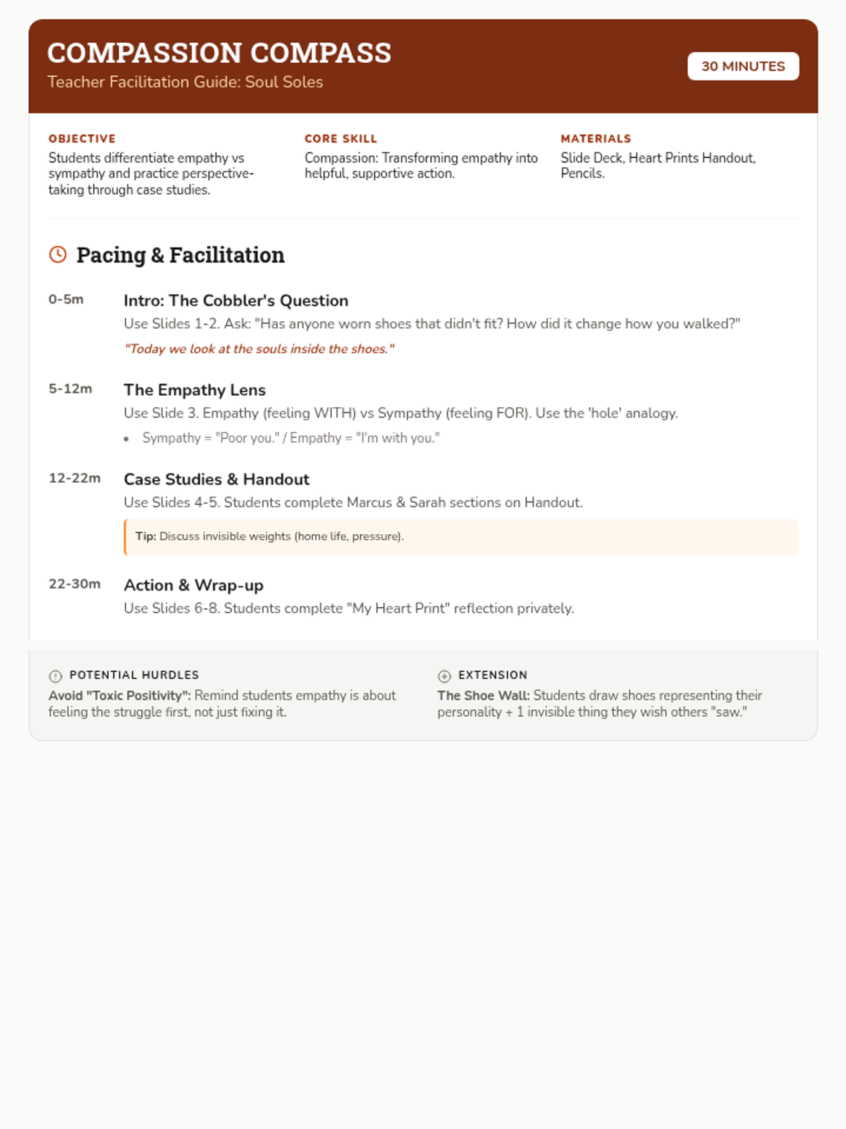 A teacher's facilitation guide for the 'Soul Soles' 30-minute empathy lesson. It includes a minute-by-minute pacing guide, specific script suggestions, and discussion tips. Optimized for a single-page layout.
