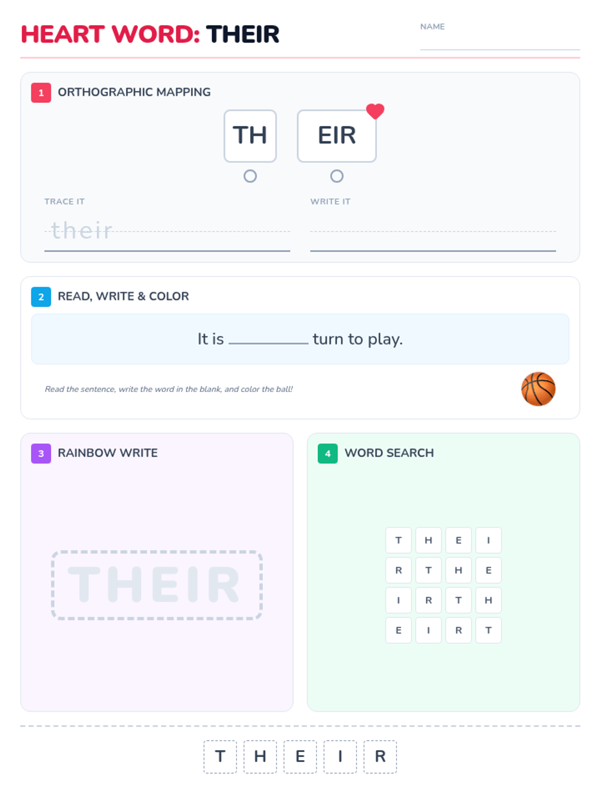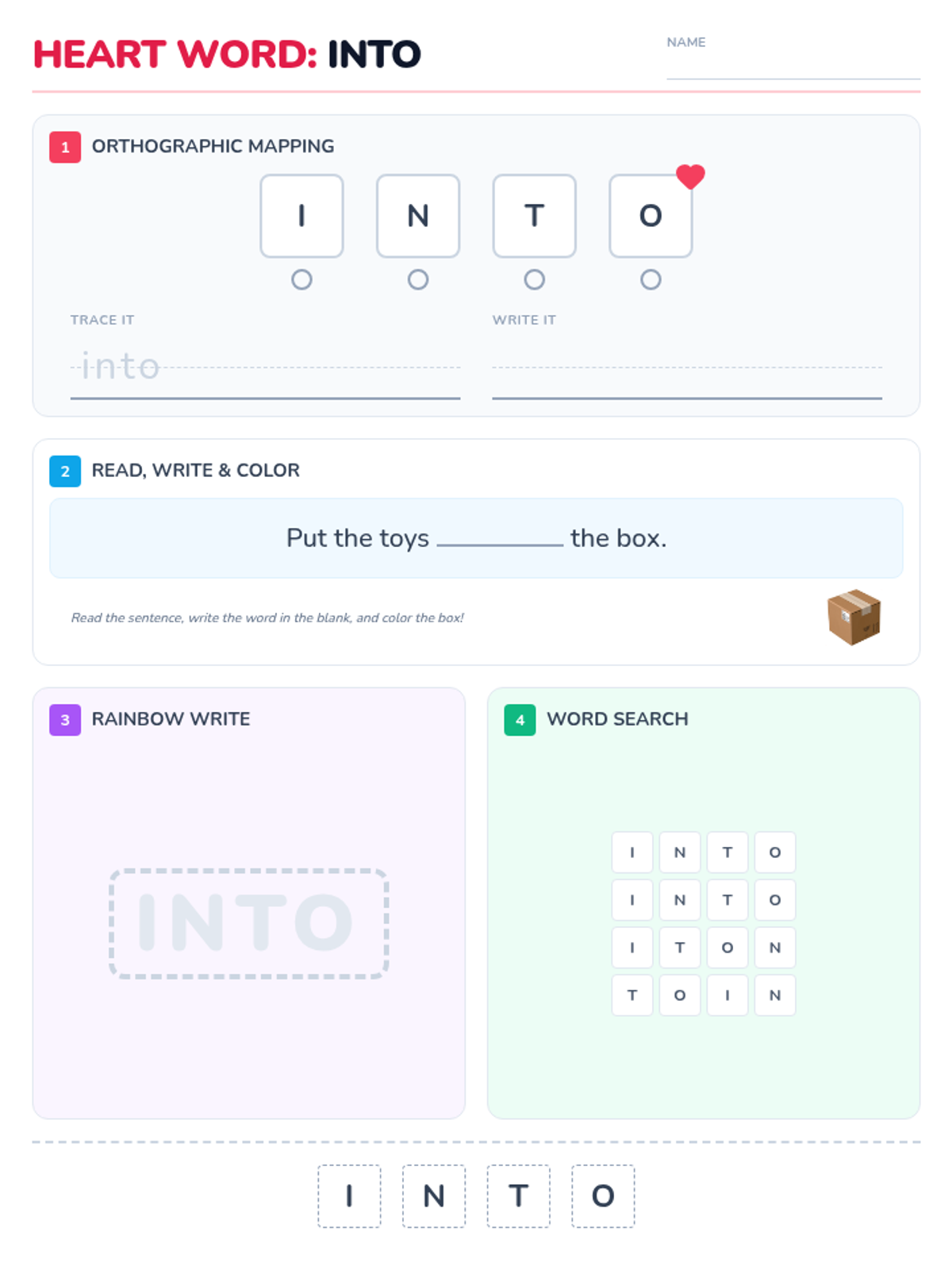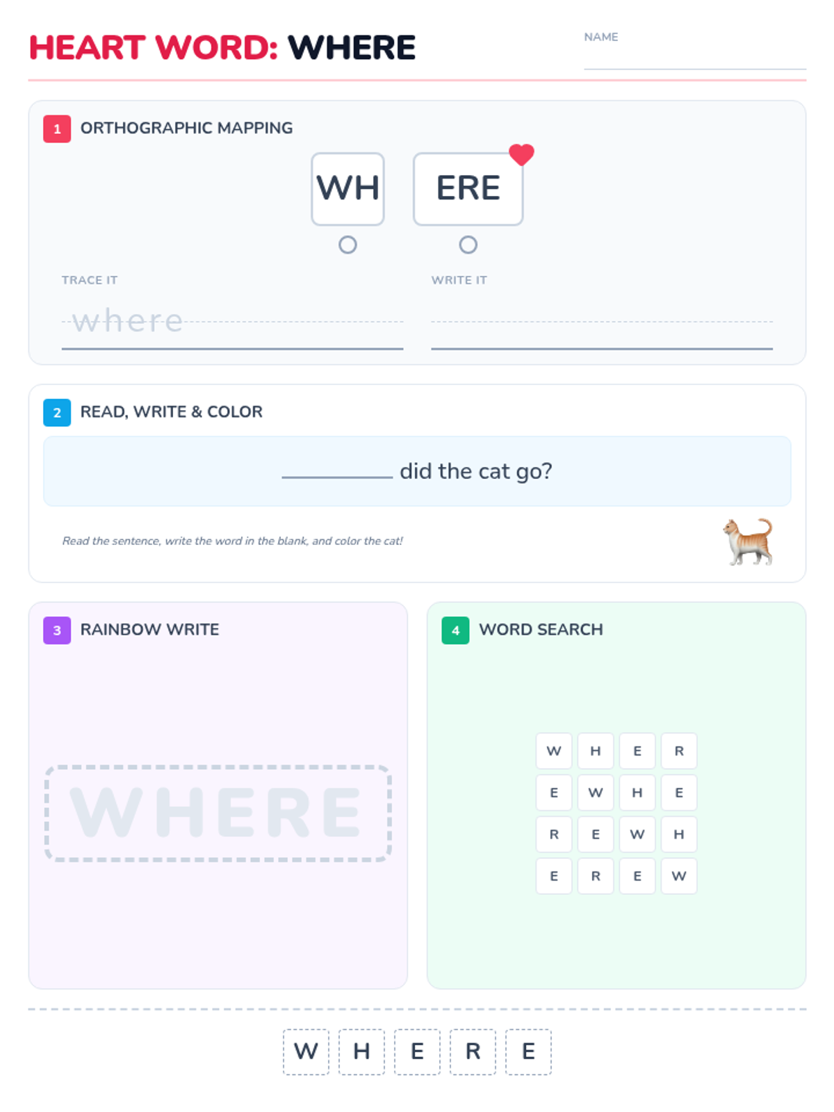 Practice pages for tricky high-frequency words such as 'Where', 'One', 'Two', and 'Does'. Features orthographic mapping, tracing, and rainbow writing.