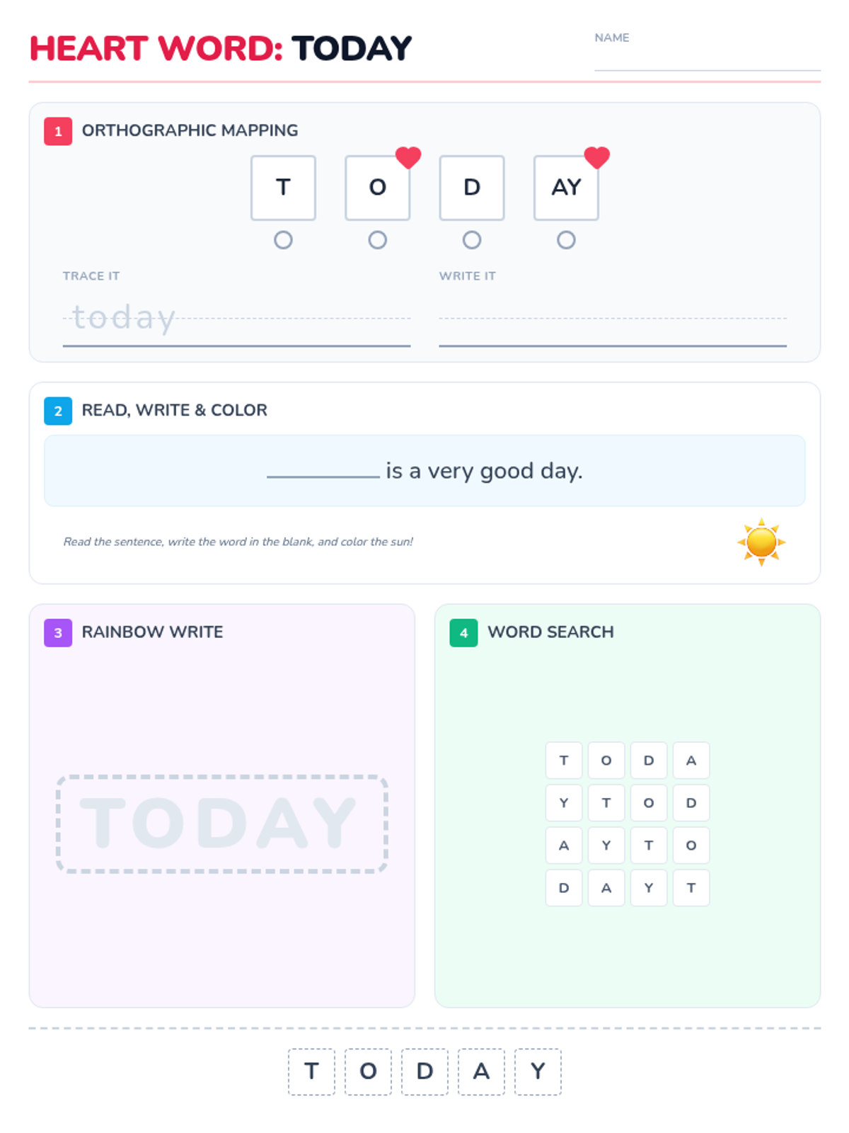 The final set of heart word practice pages covering time and place concepts like 'Today', 'Above', 'Again', and 'Always'.