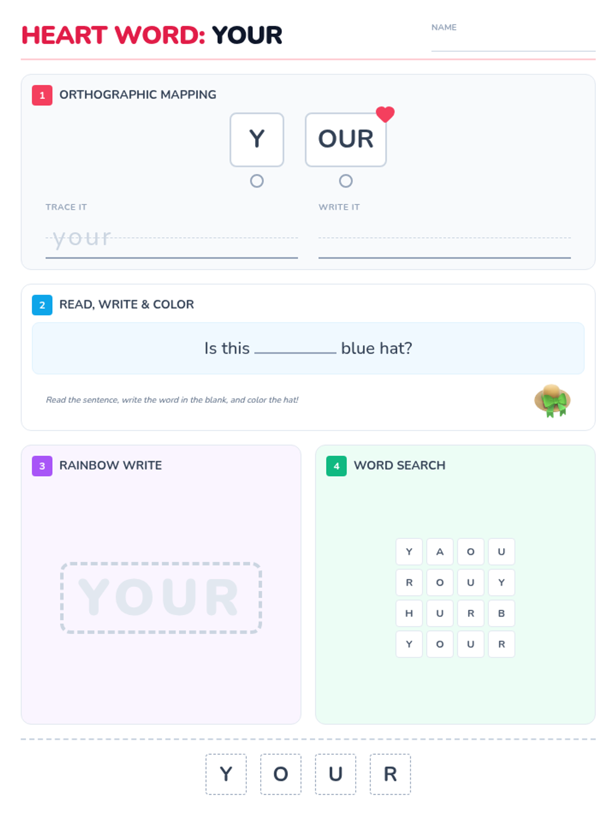 The first set of heart word practice pages for common starters like 'Your', 'Want', and 'Go'. Each page features UFLI-aligned orthographic mapping, tracing, sentence reading, and word-building activities.