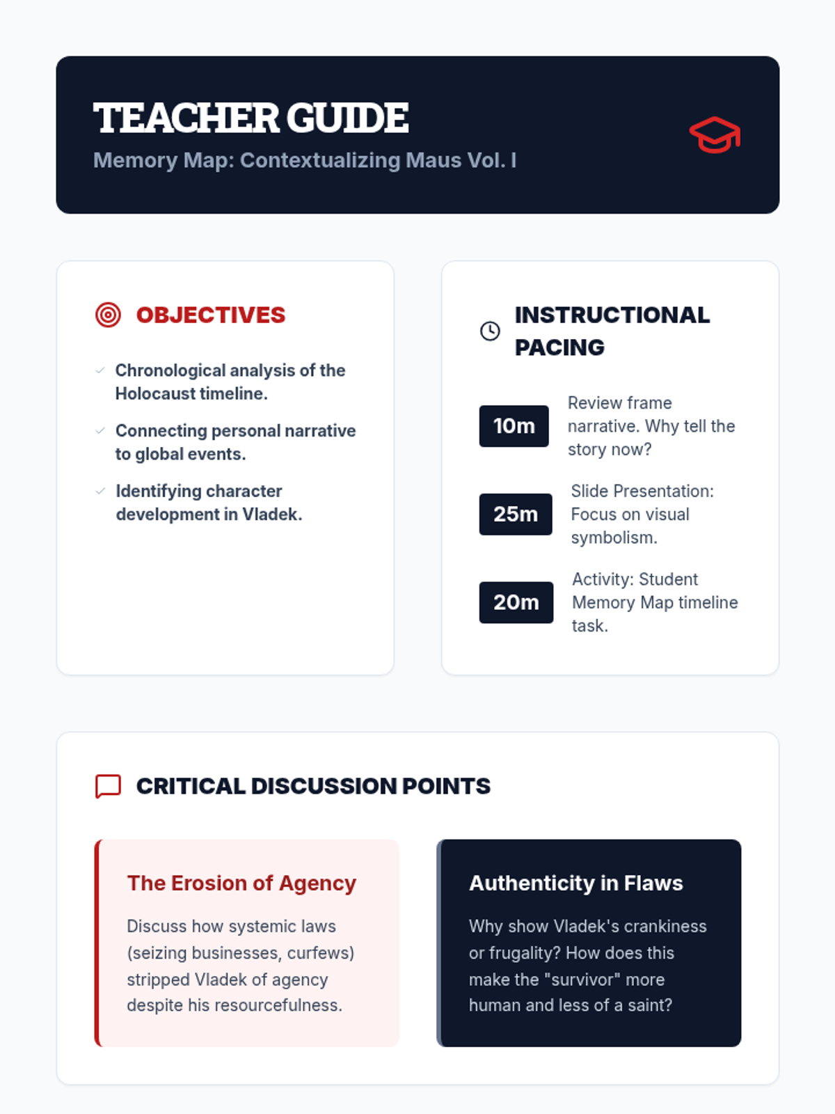 An instructional guide for teachers to facilitate lessons on Maus Volume I. Revised for better page breaks, icon consistency, and concise content layout.