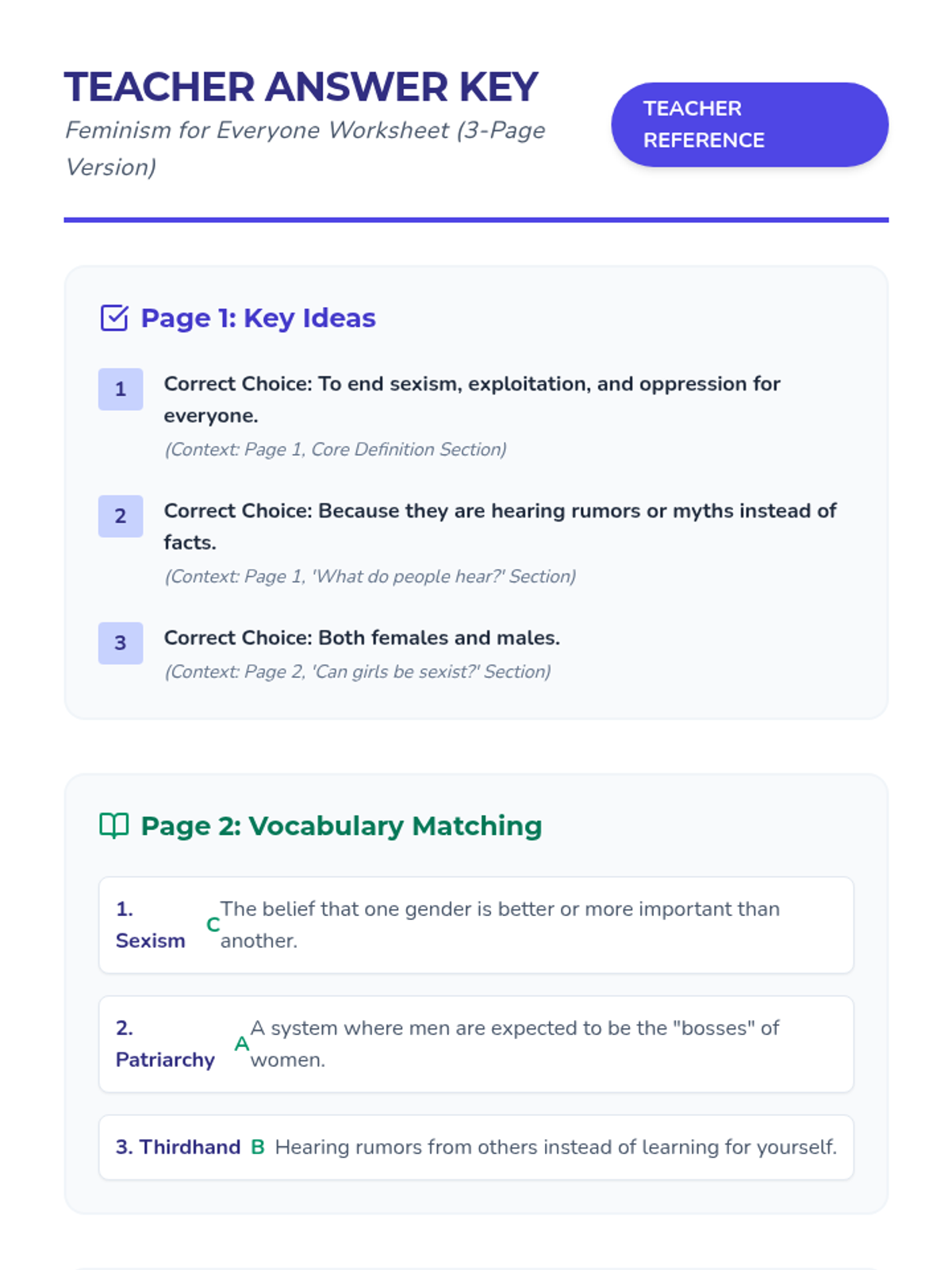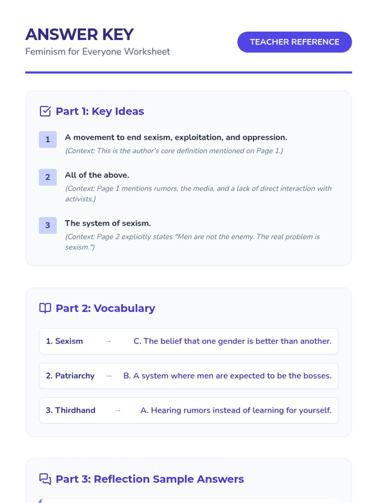 An answer key for the 'Feminism for Everyone' worksheet, including sample responses for short-answer questions.