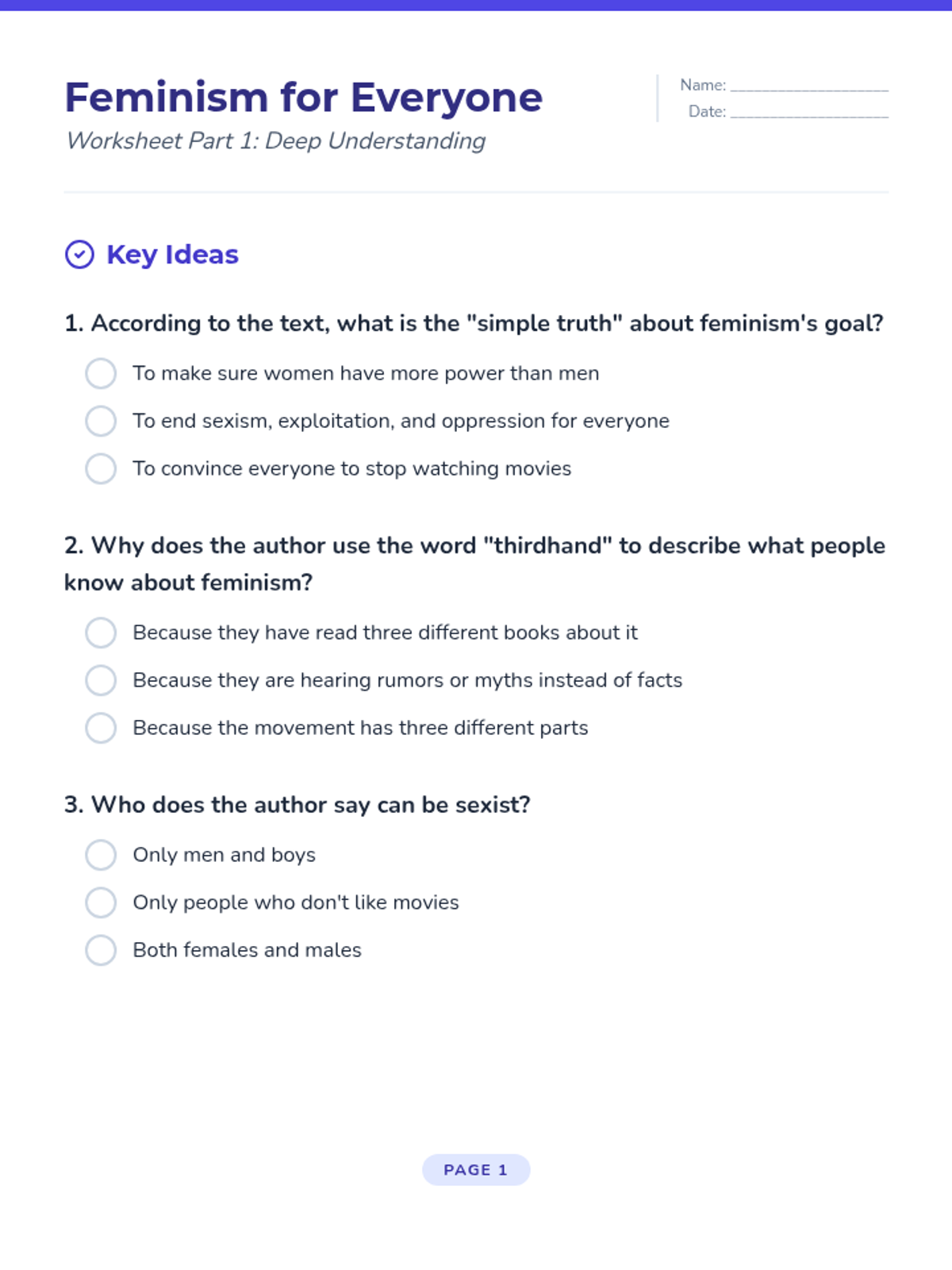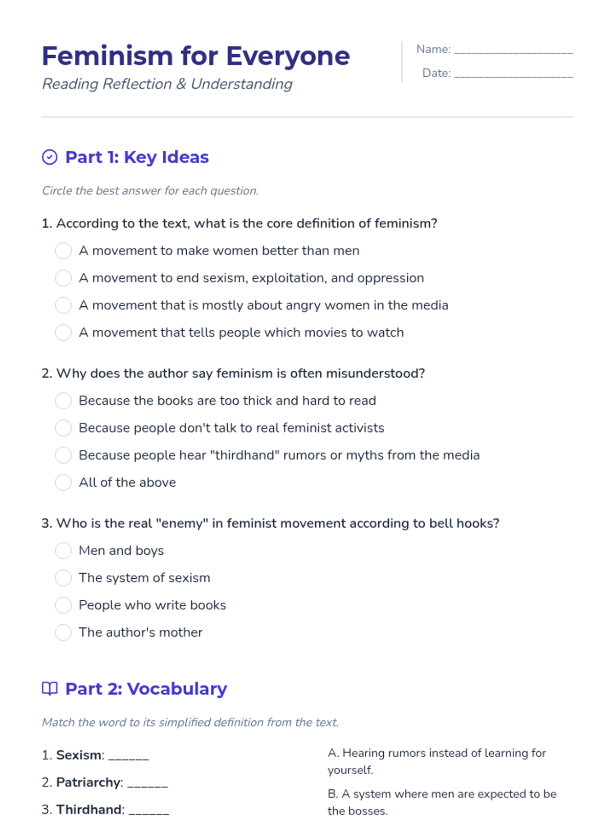 A comprehension worksheet to accompany the 'Feminism for Everyone' reading passage. Includes multiple choice questions, vocabulary matching, and short-answer reflection questions for middle school students.