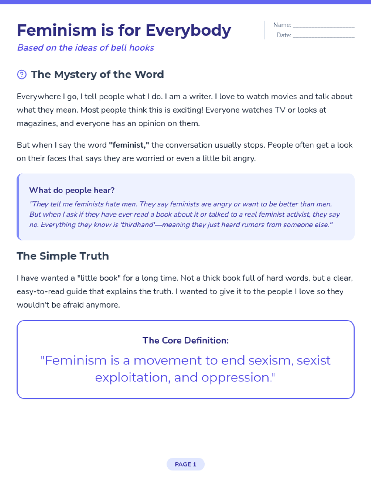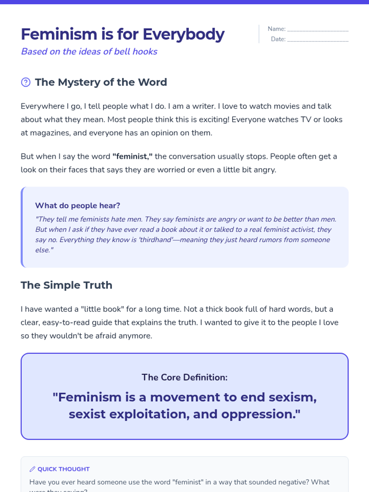 A three-page simplified reading passage based on the introduction to bell hooks' 'Feminism is for Everybody'. It explains the core definition of feminism, debunks common myths, and presents a vision for a world of equality at a 6th-grade reading level. Includes quick reflection prompts on each page.