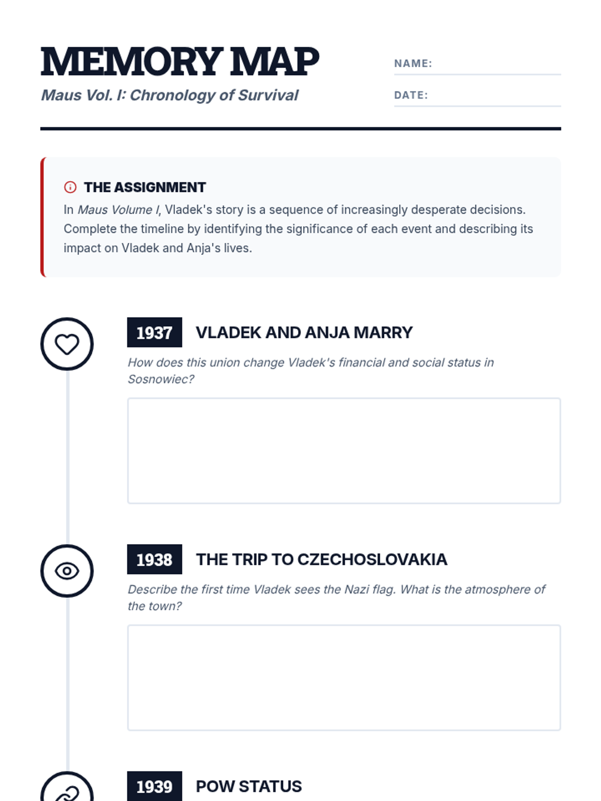 A student activity sheet requiring learners to identify key moments and describe their significance in the chronological narrative of Maus Vol. I. Revised for improved page flow and visual consistency.