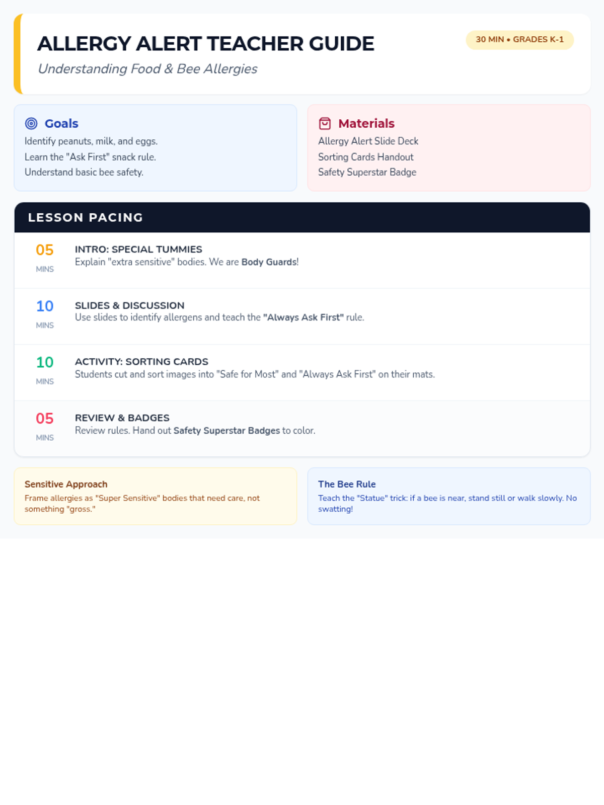 A detailed 30-minute lesson plan for teachers, including pacing, discussion prompts, and key safety takeaways for an allergy awareness lesson.