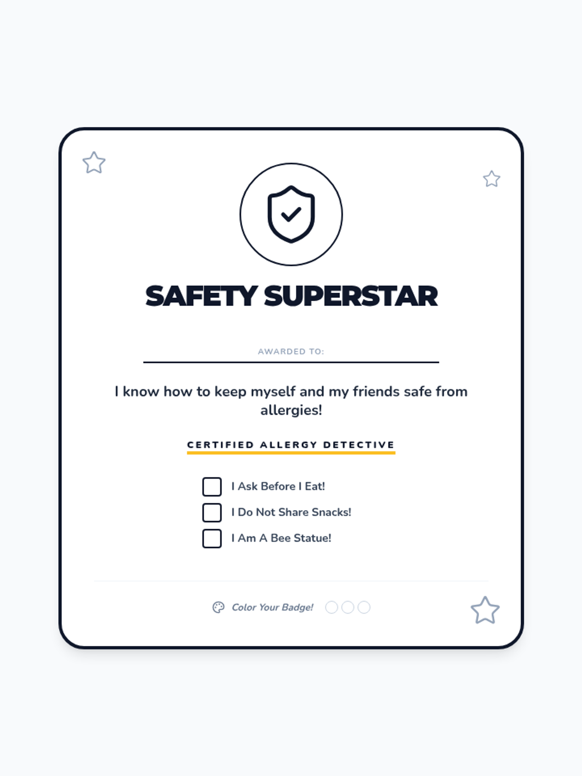 A printable award certificate for students to color and take home after completing the allergy safety lesson. Includes a checklist of key safety behaviors.