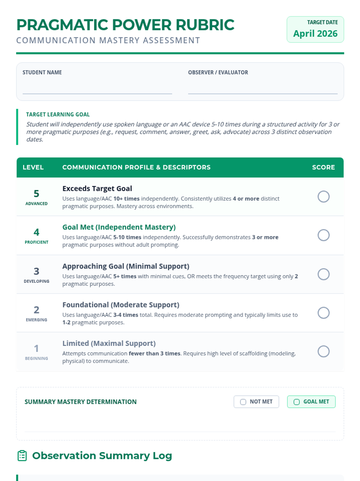 A structured 5-point assessment rubric designed to measure a student's pragmatic communication functions, frequency, and independence using spoken language or AAC devices. Includes detailed observation logs for three distinct evaluation dates and a final mastery determination section.