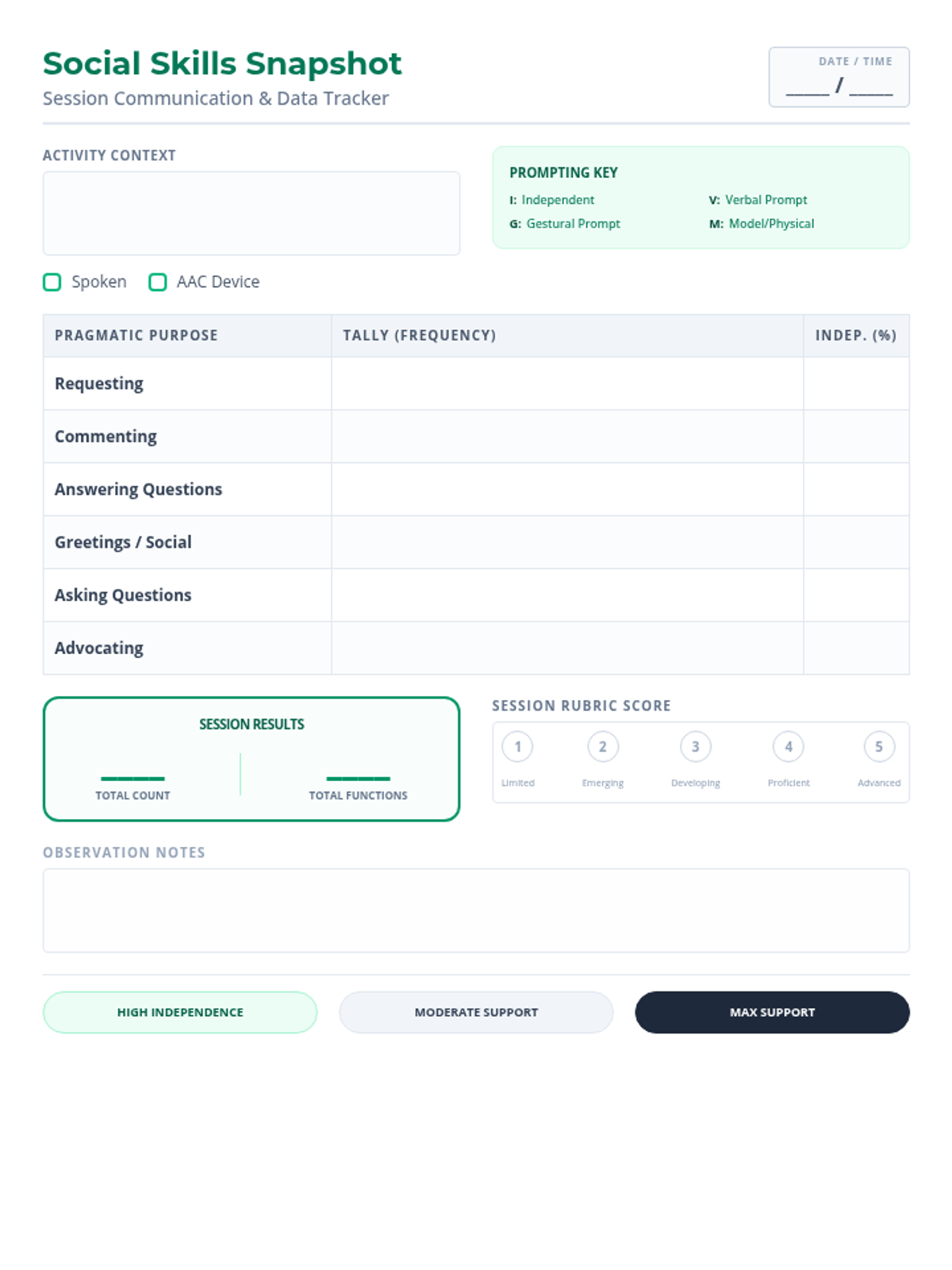 A quick-use data collection sheet for tracking student pragmatic communication attempts during a single session. Features tally sections for specific communication functions, prompting levels, and summary calculations to inform the master rubric. Includes a simplified scoring scale with descriptors.