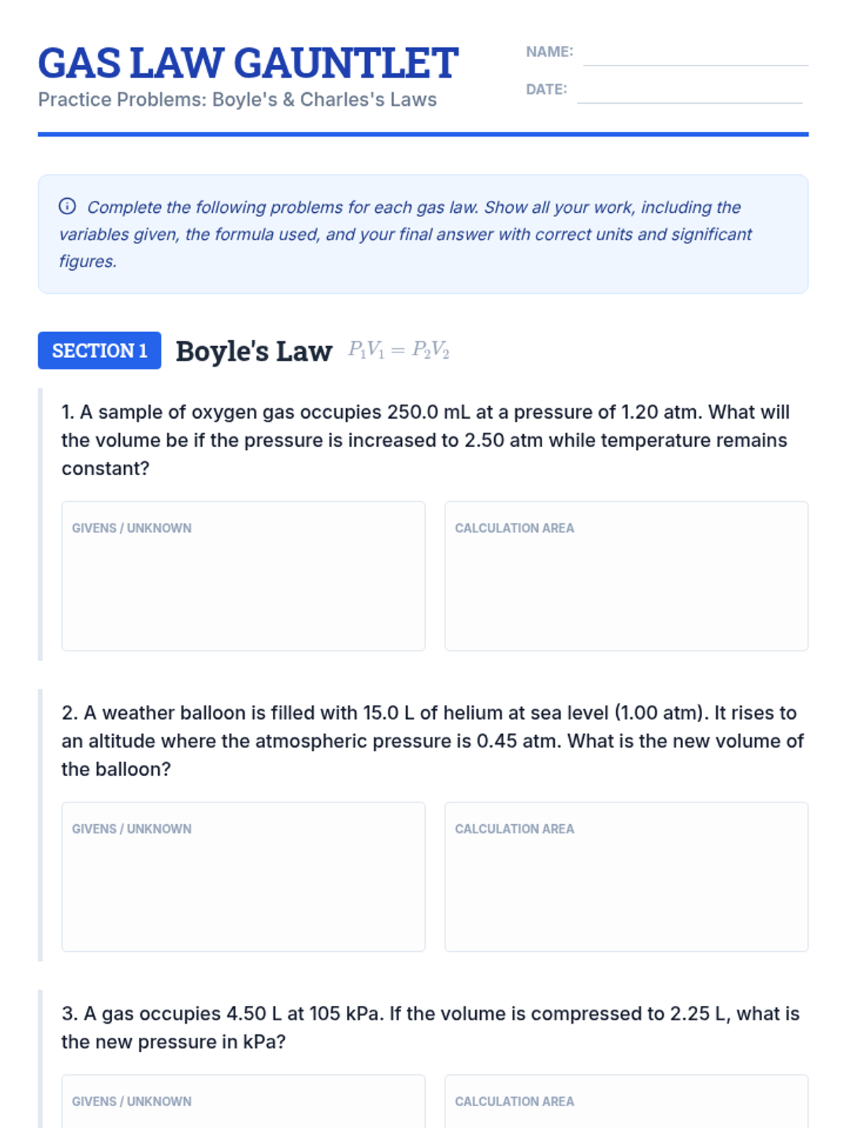 A four-page comprehensive practice worksheet covering Boyle's, Charles's, Gay-Lussac's, Combined, Ideal, and Dalton's gas laws, featuring three curated problems for each law with dedicated spaces for givens and calculations.
