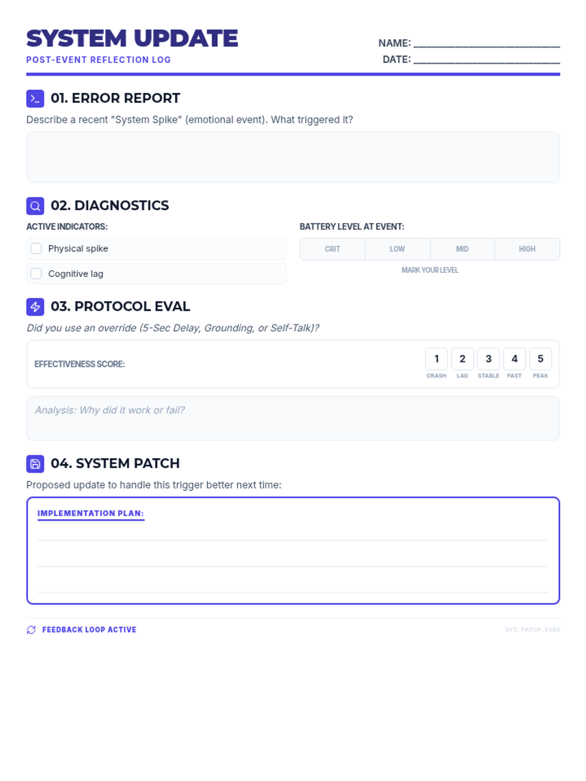 A student reflection sheet styled as a 'System Update' log. It guides high schoolers through reflecting on a recent emotional event, identifying their battery levels and triggers, evaluating the effectiveness of regulation protocols, and planning a 'patch' for future occurrences. Optimized to fit on a single page.
